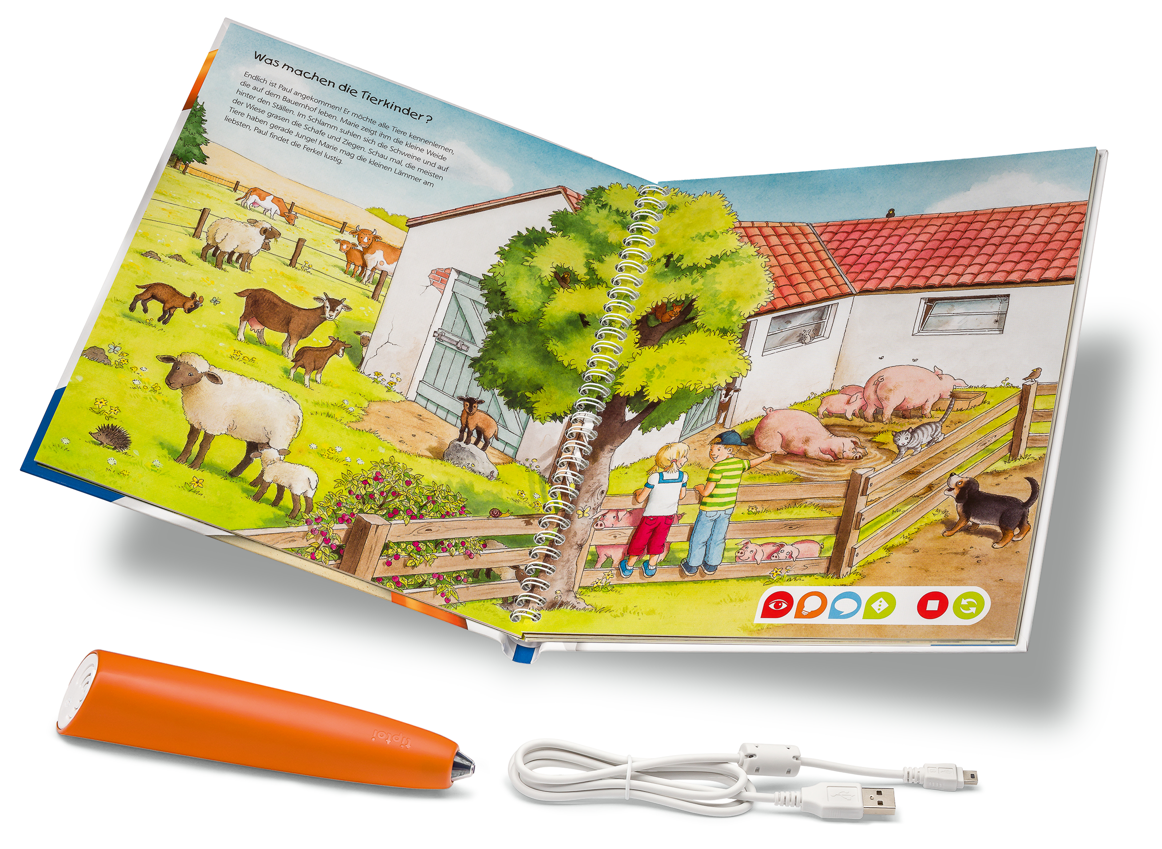 Die bekannte Frage "Wie macht die Kuh?" wird im tiptoi® Starter-Set mit Stift und Buch "Wieso? Weshalb? Warum? Entdecke den Bauernhof" ebenso beantwortet wie Detailwissen über das Melken, den Alltag der Tierkinder oder den Hühnerstall. tiptoi® macht den Bauernhof lebendig: Die Kinder lernen interaktiv durch 600 lebensechte Geräusche, faszinierende Bilder, Dialoge und Kinderlieder. Je nach Interesse wählen die Kinder eigenständig mit dem tiptoi® Stift verschiedene Erlebnisebenen aus. Tippen sie auf "Entdecken", muht die Kuh, rattert der Traktor oder zwitschern die Vögel. Bei "Wissen" erhalten die Kinder Hintergrundinformationen zum Leben auf dem Bauernhof. Tippen die jungen Spieler auf "Erzählen", berichten die Figuren aus ihrem Alltag.
