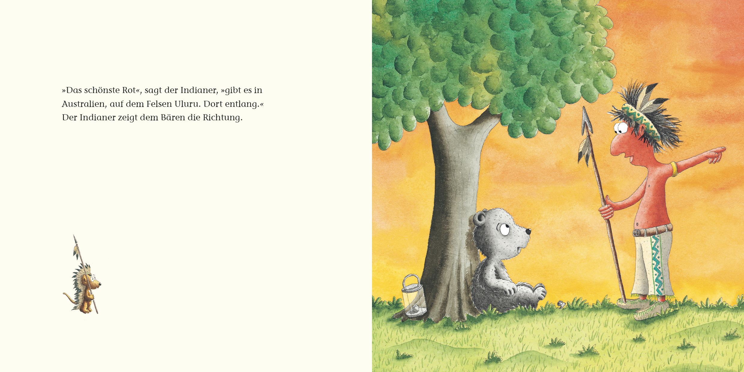 Wütend sitzt der kleine Bär auf dem Papier: Sein Zeichner hat ihn nur mit einem schwarzen Stift gemalt. Wie gern hätte der Bär schönes braunes Fell und würde auf einer bunten Blumenwiese herumtollen! Also schleicht er in der Nacht aus dem Buch und sucht die Farben. Ein wunderbares Rot findet er in Australien beim Ayers Rock. Das schönste Blau gibt es am Meer und das strahlendste Gelb auf dem Mond. Glücklich kehrt der Bär ins Buch zurück, denn mit den drei Grundfarben kann sein Zeichner jetzt alle Farben mischen ...