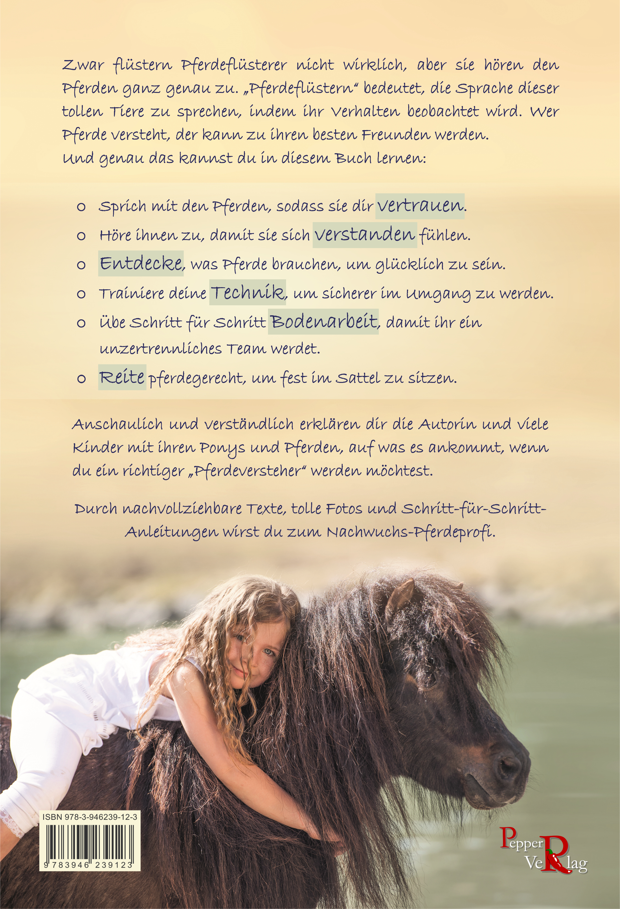 Zwar flüstern Pferdeflüsterer nicht wirklich, aber sie hören den Pferden ganz genau zu. "Pferdeflüstern" bedeutet, die Sprache dieser tollen Tiere zu sprechen, indem ihr Verhalten beobachtet wird. Wer Pferde versteht, der kann zu ihren besten Freunden werden. Und genau das kannst du in diesem Buch lernen:-Sprich mit den Pferden, sodass sie dir vertrauen.-Höre ihnen zu, damit sie sich verstanden fühlen.-Entdecke, was Pferde brauchen, um glücklich zu sein.-Trainiere deine Technik, um sicherer im Umgang zu werden.-Übe Schritt für Schritt Bodenarbeit, damit ihr ein unzertrennliches Team werdet.-Reite pferdegerecht, um fest im Sattel zu sitzen. Anschaulich und verständlich erklären dir die Autorin und viele Kinder mit ihren Ponys und Pferden, auf was es ankommt, wenn du ein richtiger "Pferdeversteher" werden möchtest. Durch nachvollziehbare Texte, tolle Fotos und Schritt-für-Schritt-Anleitungen wirst du zum Nachwuchs-Pferdeprofi.