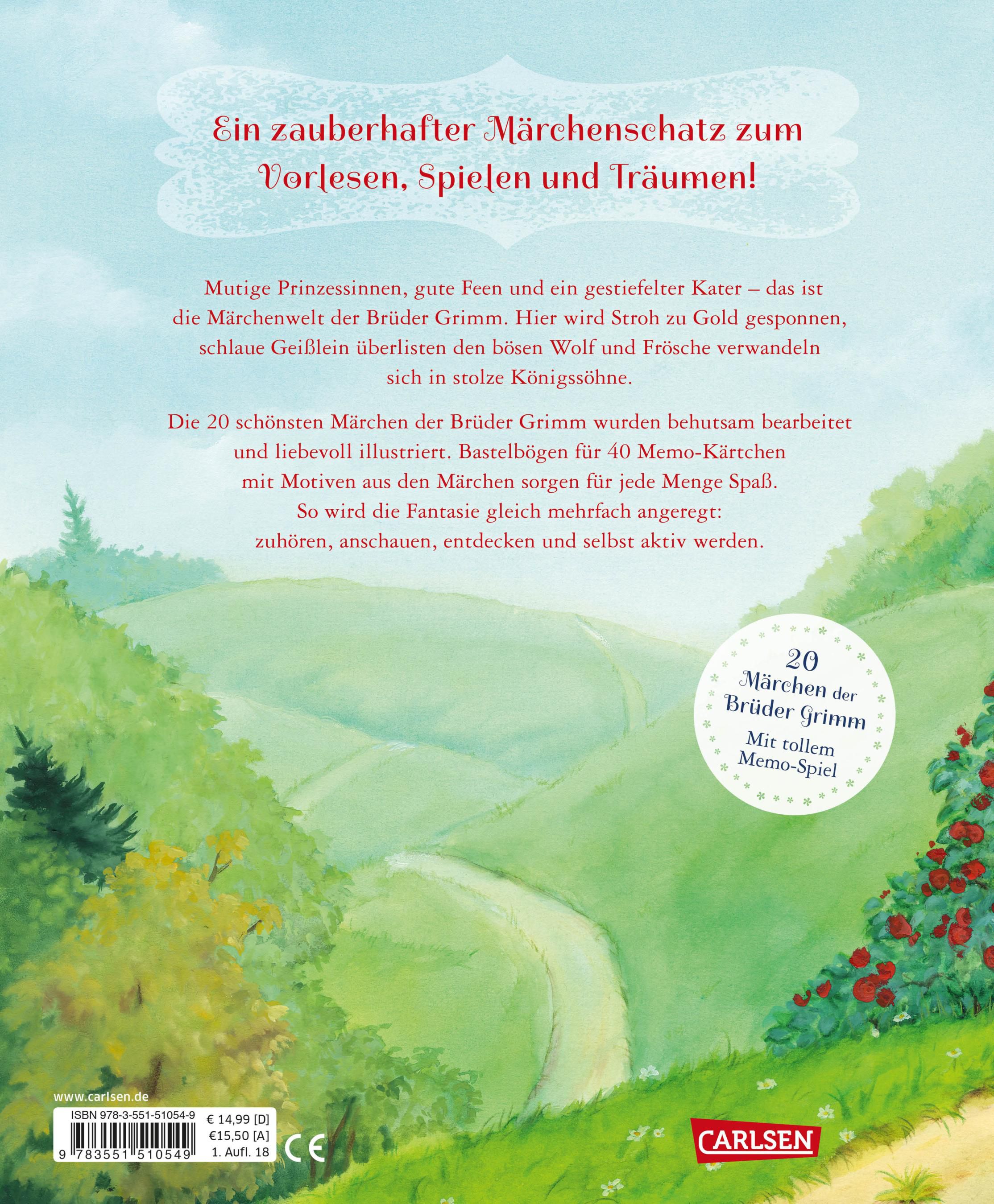 Diese Sammlung bietet alles, was das Kinderherz begehrt. Die 20 schönsten grimmschen Märchen wurden behutsam bearbeitet und zauberhaft kindgerecht illustriert. Bastelbögen für 40 Memo-Kärtchen mit Motiven aus den Märchen sorgen für jede Menge Spaß. So wird die Fantasie gleich mehrfach angeregt: zuhören, anschauen, entdecken und selbst aktiv werden.