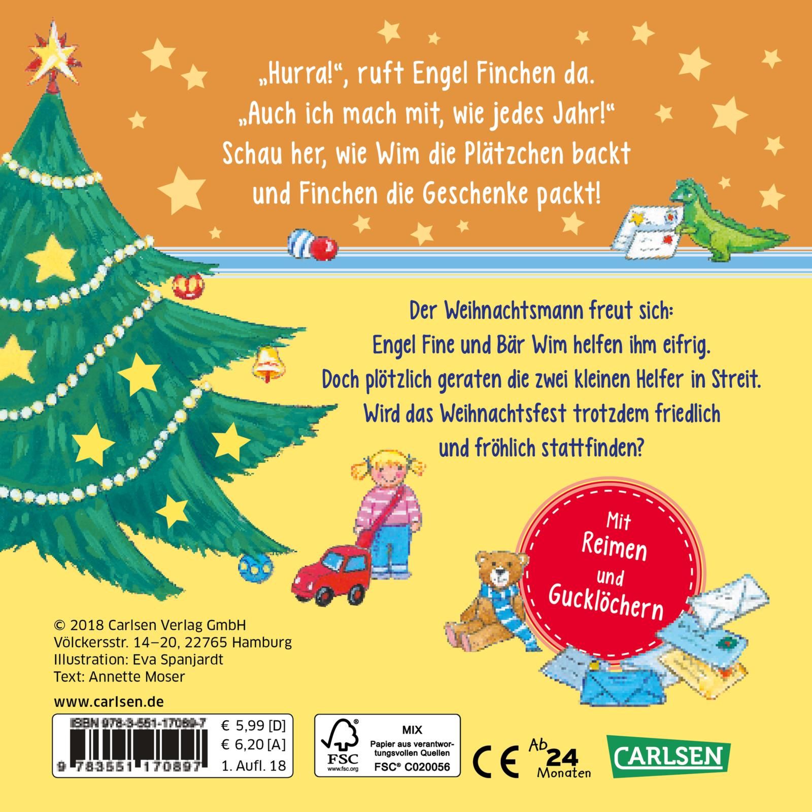 Der Weihnachtsmann hat noch viel zu tun. Wie gut, dass Wim Weihnachtsbär und Engel Finchen ihm beim Geschenkepacken und Plätzchenbacken helfen. Doch Wims neue Plätzchen freuen den Weihnachtsmann so sehr, dass Finchen eifersüchtig wird und Wims Plätzchen heimlich zerbröselt. Wim ist sehr traurig, und der Weihnachtsmann schaut Finchen streng an. Aber Wim und Finchen wären nicht die besten Weihnachtshelfer, wenn sie sich nicht wieder vertragen würden.