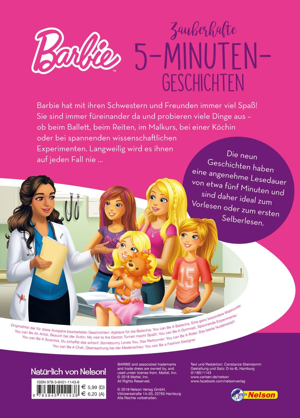 Neun wunderschön illustrierte Barbie-Geschichten für kleine Leser und Fans, mit einer idealen Leselänge von 5 Minuten und damit optimal zum Vorlesen oder dem erstem Selberlesen. Die Themen wie Reiten, Ballett und Malen machen besonders Mädchen Spaß und nehmen sie mit in die Welt von Barbie und ihren Freundinnen.