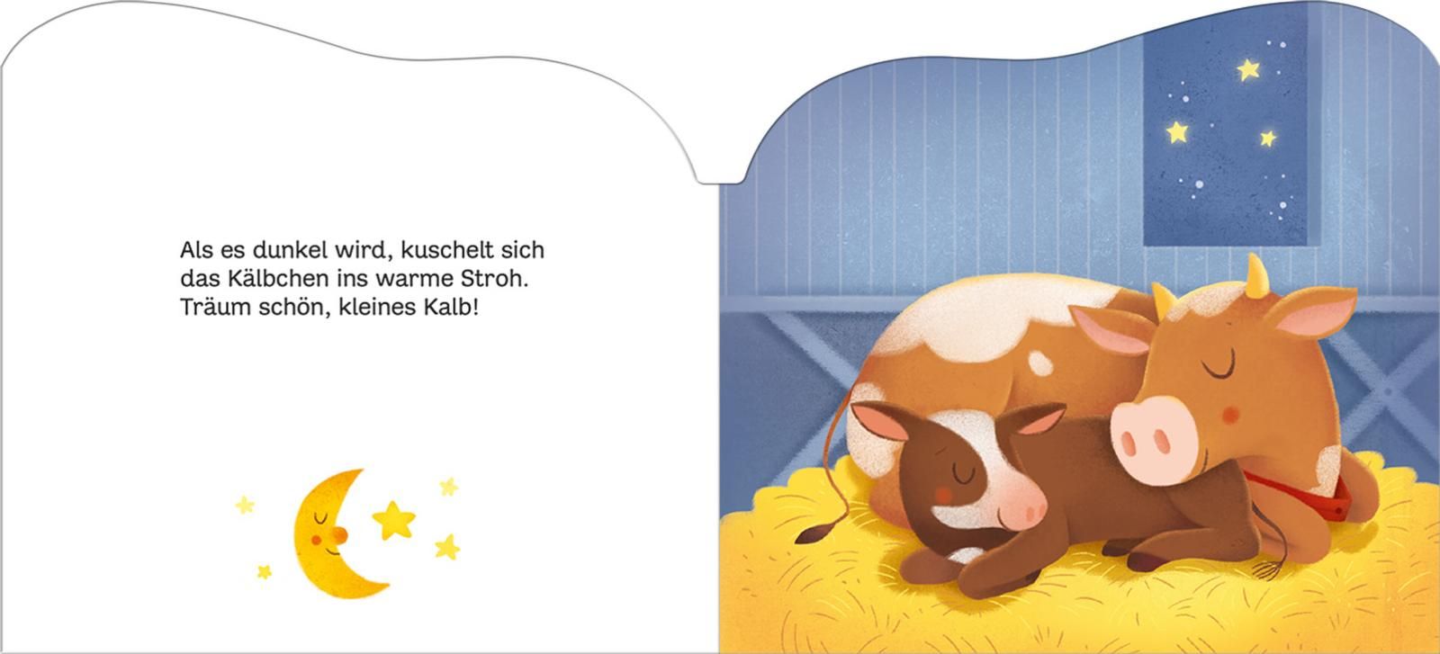 Dieses Büchlein erzählt eine Geschichte vom kleinen Kälbchen und seinem ersten Ausflug auf die Weide - und schüttelt man es, wird die kleine Kuh lebendig und es ertönt ein fröhliches "Muuuh".