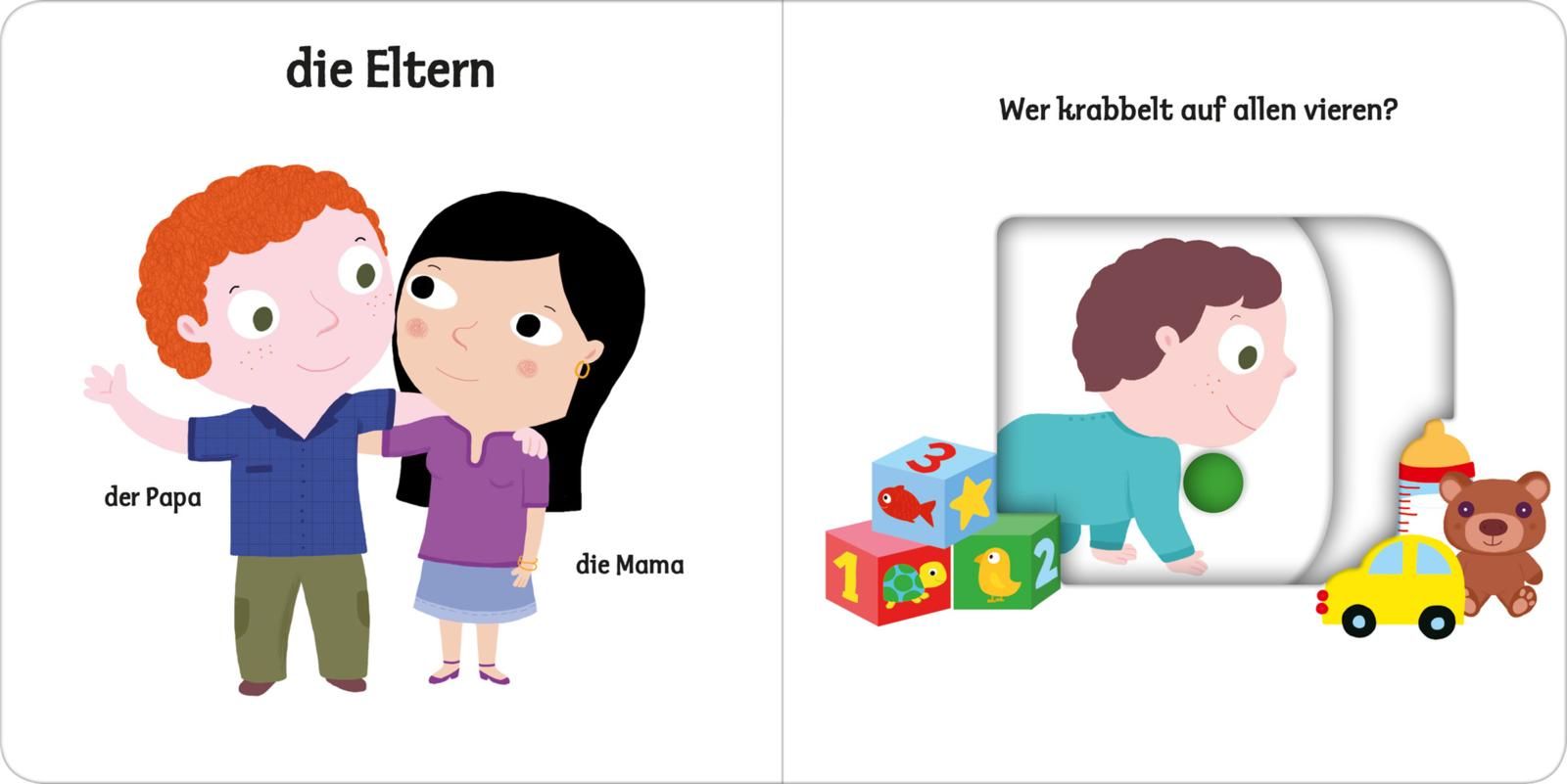 Bunte, leicht zu erkennende Bilder, eine klare Aufteilung und nicht zu viel auf einer Seite: Hier lernen schon Kinder ab einem Jahr erste Wörter zum Thema "Familie". Die lustigen und stabilen Schiebeelemente im Buch fördern die Feinmotorik und das Verständnis. Einfach den großen Schieber bewegen und schon verstecken sich die Geschwister hinter dem Busch. Sehen, zuhören, aktiv werden - so wird Sprechenlernen zum Kinderspiel, egal ob zu Hause, bei der Oma, im Kindergarten oder in der Krippe.