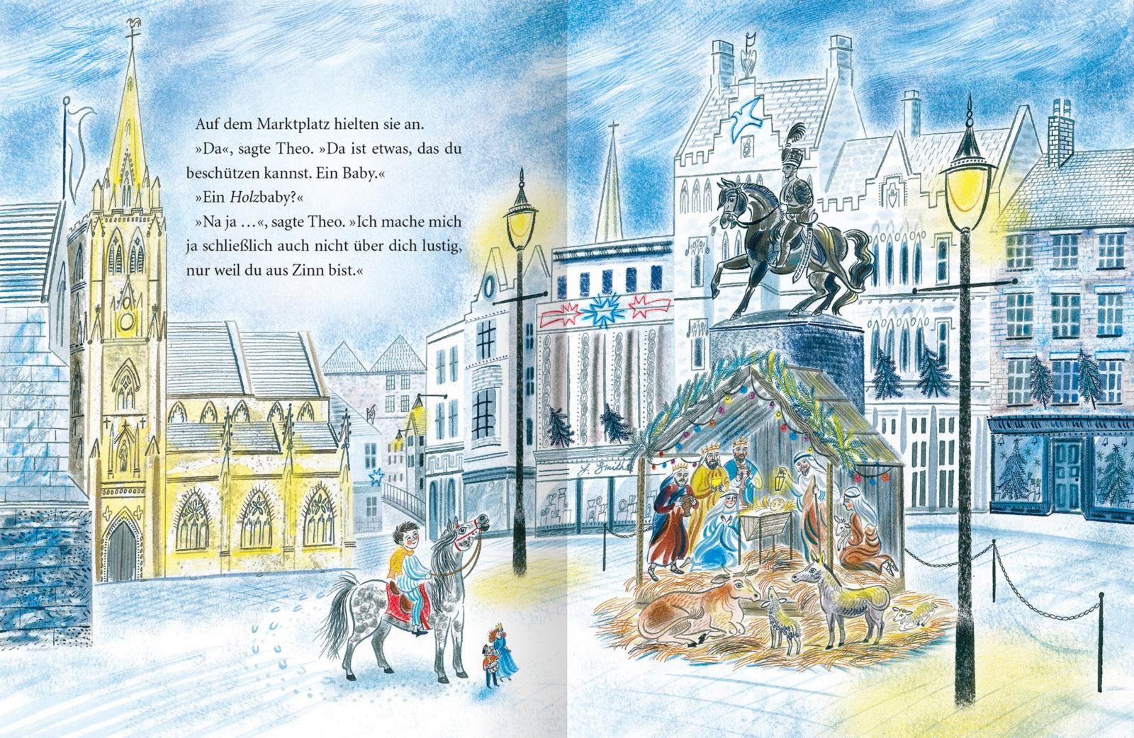 Im nächsten Moment werden vier Figuren lebendig, die Theo als Schmuck an den Weihnachtsbaum gehängt hat: Ein Schaukelpferd, ein Engelchen, ein Trommler und ein Rotkehlchen begleiten Theo durch einen ganz und gar wunderbaren und magischen Weihnachtsabend ...