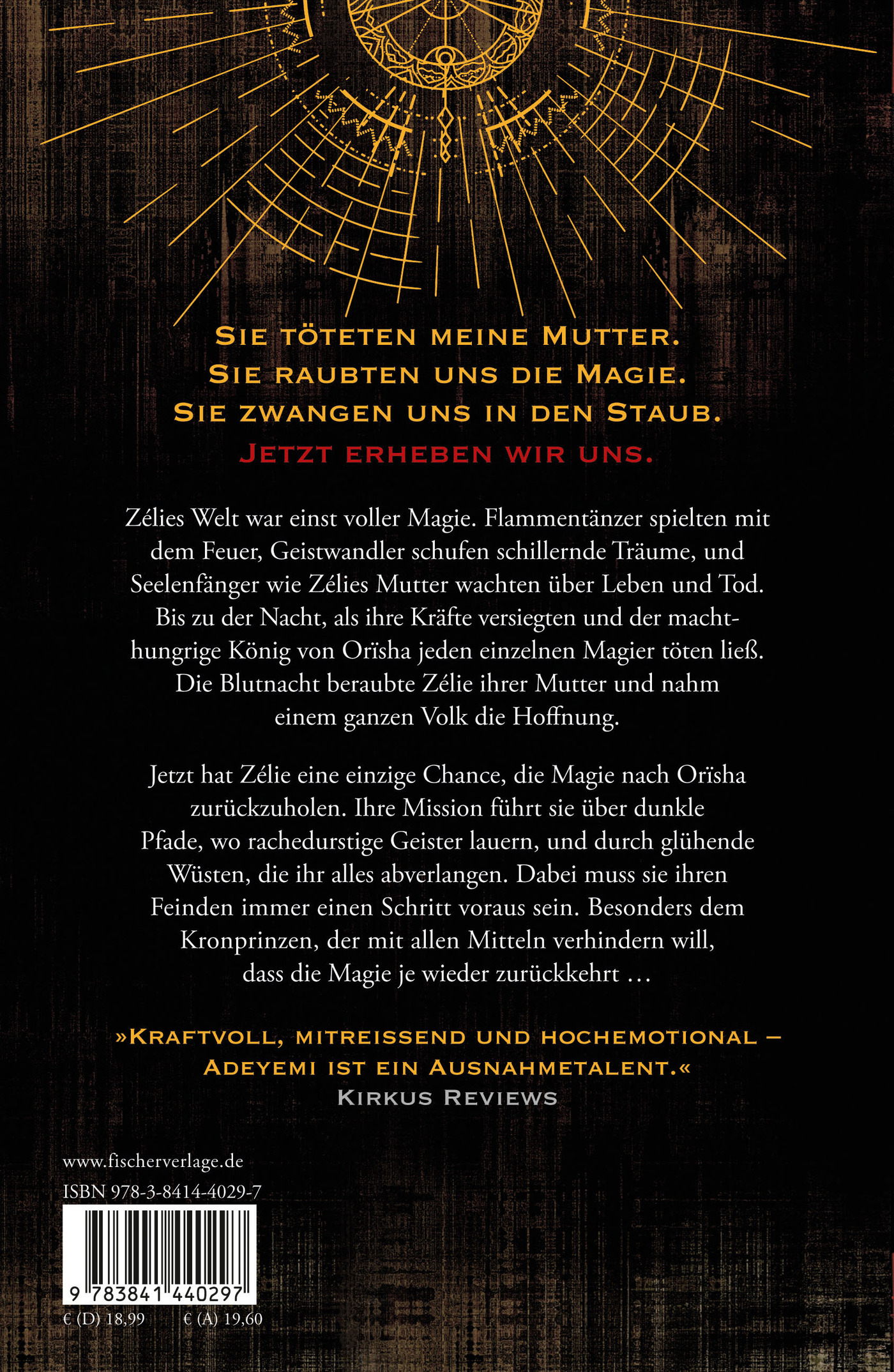 Zélies Welt war einst voller Magie. Flammentänzer spielten mit dem Feuer, Geistwandler schufen schillernde Träume, und Seelenfänger wie Zélies Mutter wachten über Leben und Tod. Bis zu der Nacht, als ihre Kräfte versiegten und der machthungrige König von Orïsha jeden einzelnen Magier töten ließ. Die Blutnacht beraubte Zélie ihrer Mutter und nahm einem ganzen Volk die Hoffnung.