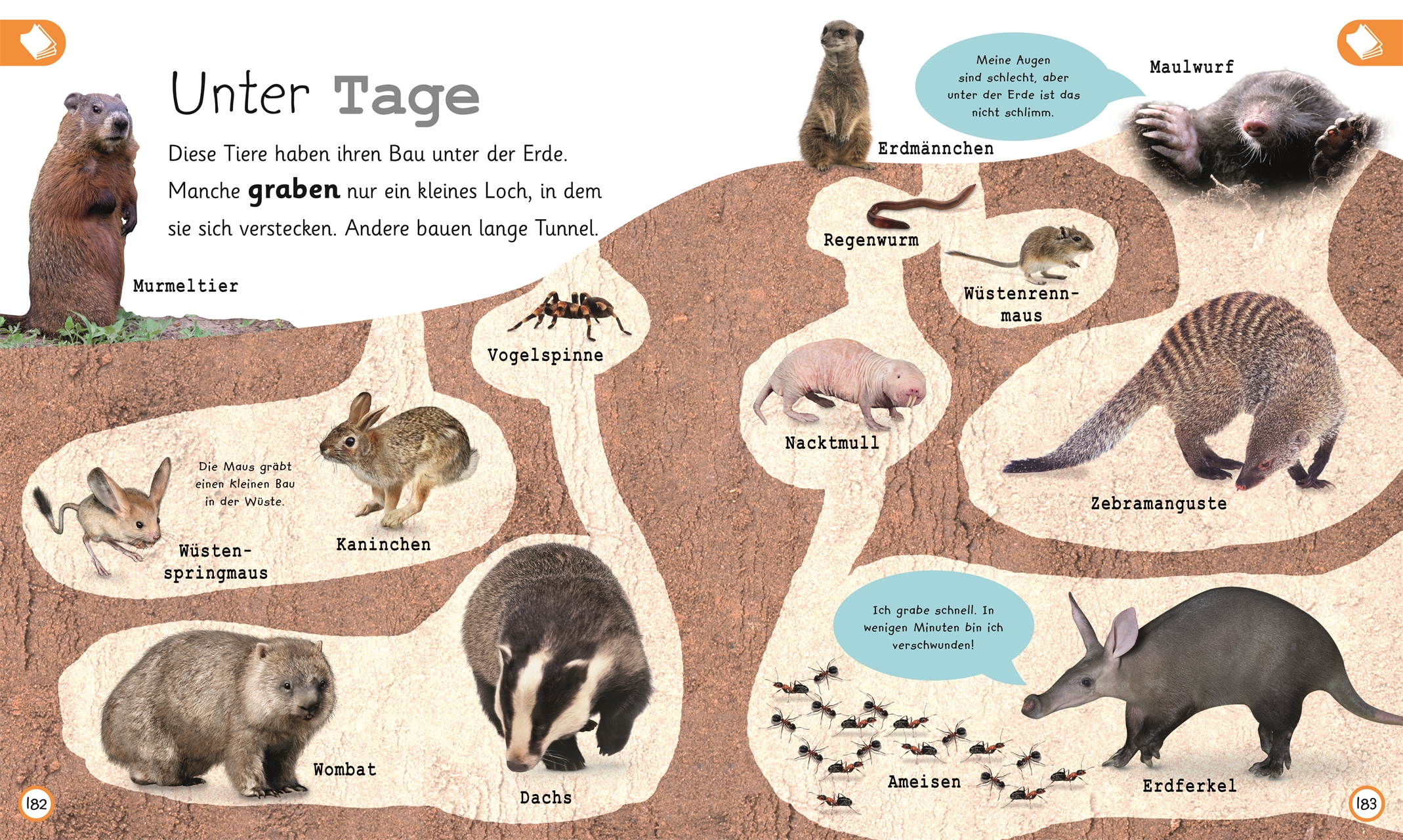 Im Wasser sind imposante Orcas, in der Luft flatternde Fledermäuse und an Land kletterlustige Orang-Utans zu Hause. Das Tierlexikon für Vorschulkinder stellt die animalischen Bewohner dieser Welt immer wieder aus anderen Blickwinkeln dar. So lernen die Kinder die verschiedenen Arten kennen, erfahren, wo Tiere leben und was sie fressen. Auf ausgewählten Übersichtsseiten gibt es am Ende des Buches sogar noch mehr zu entdecken, zum Beispiel die besten Haustiere, die witzigsten Tiergeräusche oder ein Glossar mit der Erklärung tierischer Fachwörter.