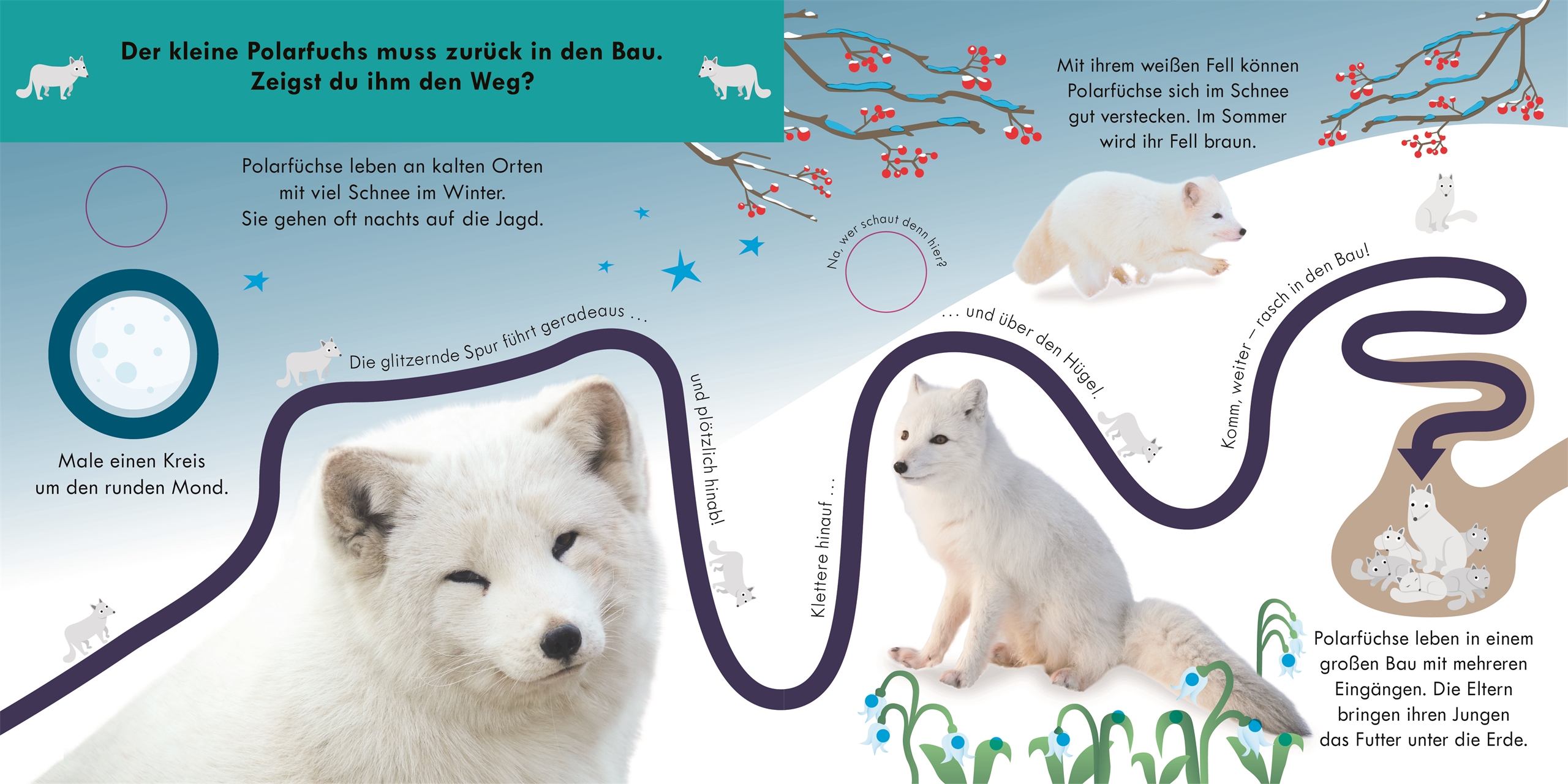 "Folge der Fingerspur. Tiere in Eis und Schnee" ist ein liebevoll gestaltetes Pappbilderbuch im schönen, großen Format mit glitzernden, erhabenen Fingerspuren. Ob Sehen, Fühlen oder Zuhören - Kinder ab einem Alter von 18 Monaten erkunden die Tiere aus Eis und Schnee entlang der Fingerspuren mit all ihren Sinnen. Sie lieben es, diese Spuren mit dem Finger nachzufahren und dabei auf jeder Seite Neues zu entdecken: kleine Aktivitäten, witzige Gucklöcher, klare Fotos, süße Illustrationen und charmante Texte. Das macht großen Spaß und fördert Feinmotorik sowie Sensorik spielerisch.