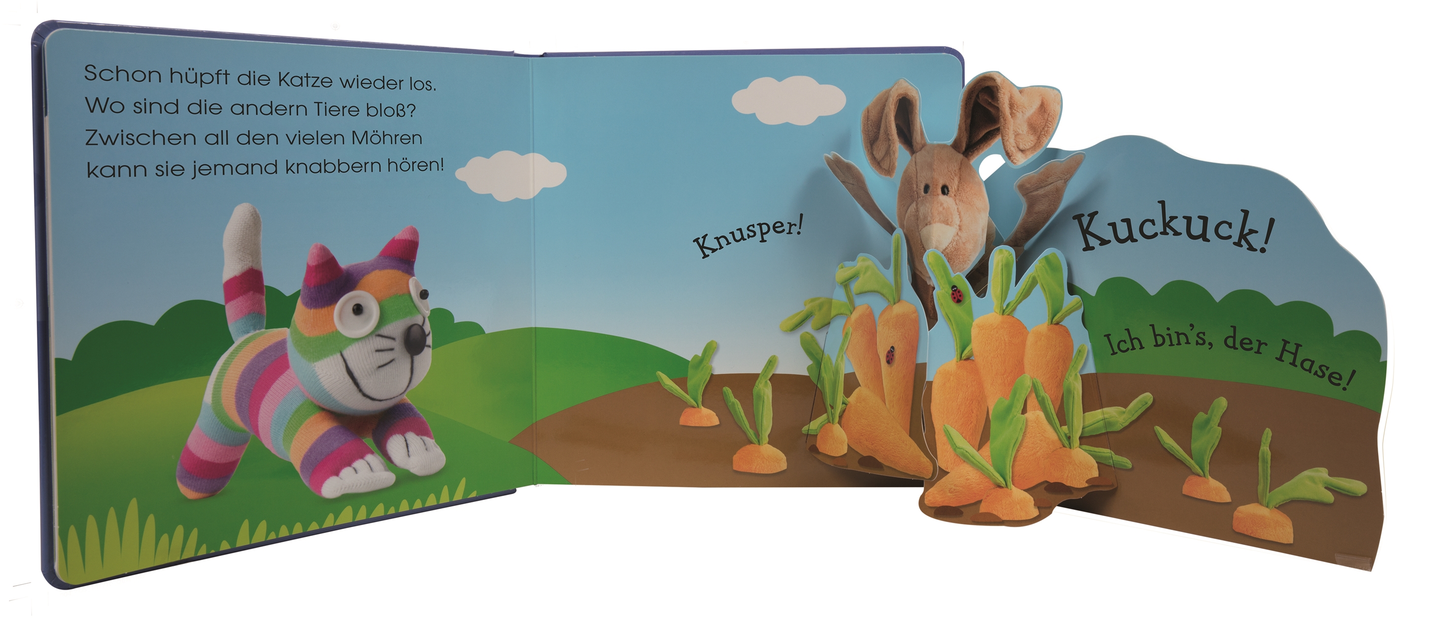 Das bunte Pop-up-Buch garantiert jede Menge Beschäftigungsspaß: Kinder werden in fröhlich gereimten Fragen dazu aufgefordert, die Antworten hinter den Klappen zu suchen. Und, tadaaa: Es entfaltet sich ein wunderschönes Pop-up-Bild, das die vermissten Tiere lebendig werden lässt.