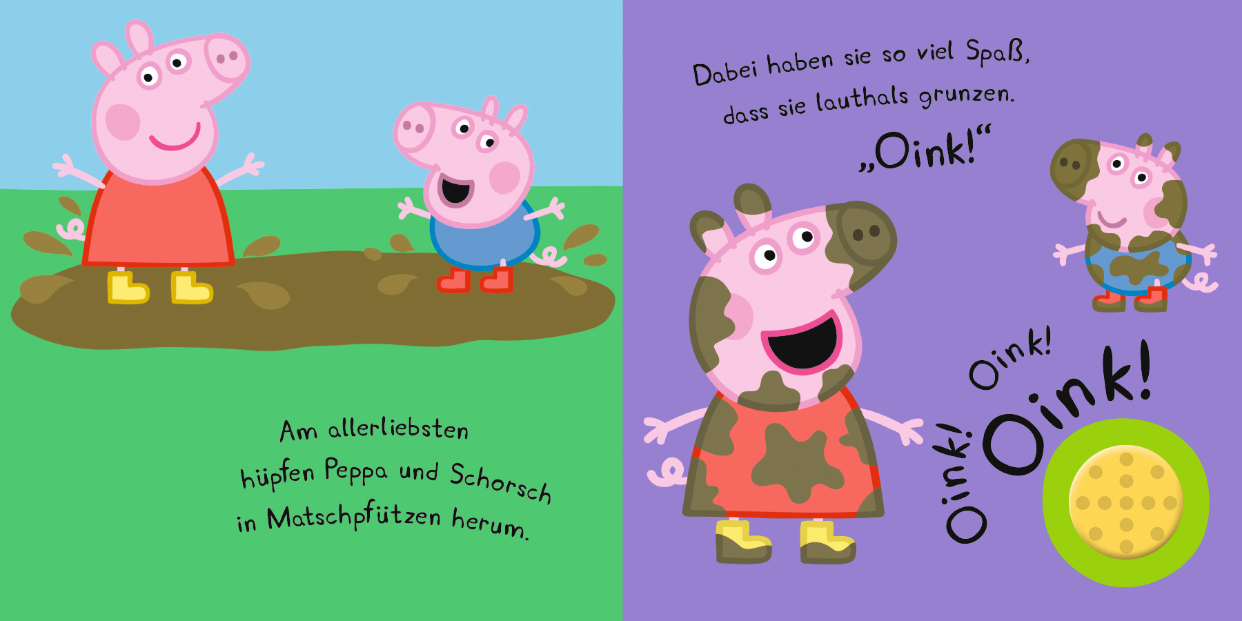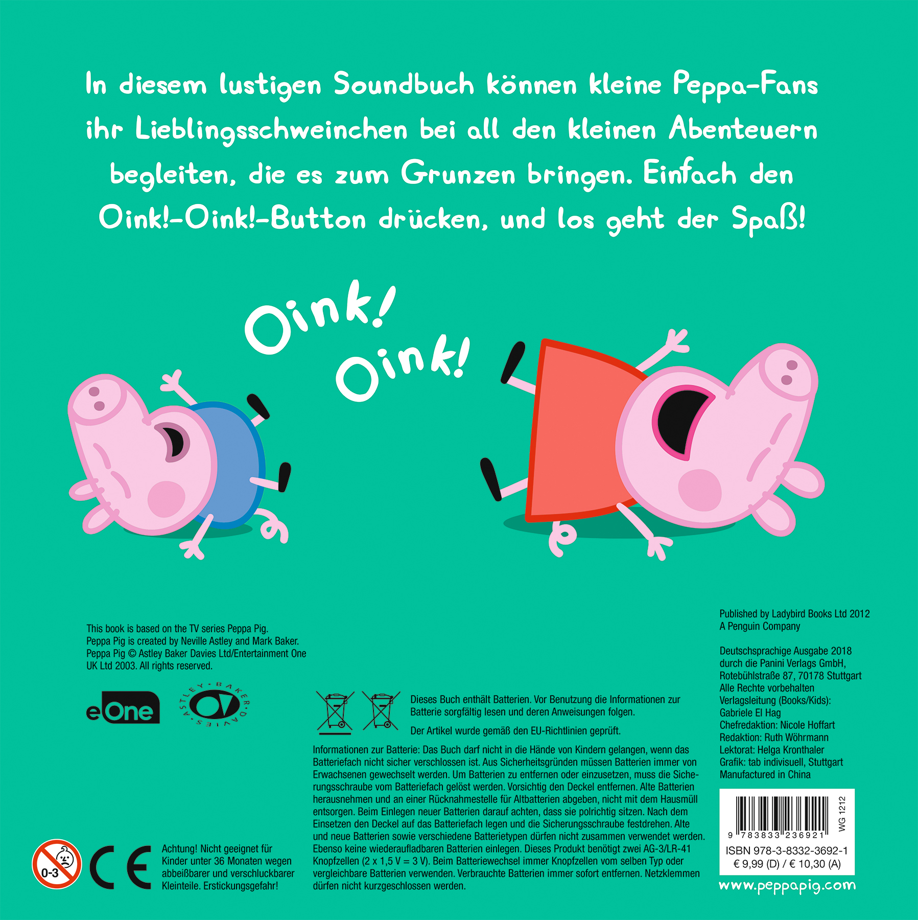In diesem lustigen Soundbuch können kleine Peppa-Fans ihr Lieblingsschweinchen bei all den kleinen Abenteuern begleiten, die es zum Grunzen bringen. Einfach den Oink!-Oink!-Button drücken, und los geht der Spaß!Diese Produkt benötigt zwei AG-3/LR-41 Knopfzellen (2 x 1,5 V = 3 V). Sie sind im Lieferumfang enthalten und können gewechselt werden. Sound-Button kann an- und ausgeschaltet werden.