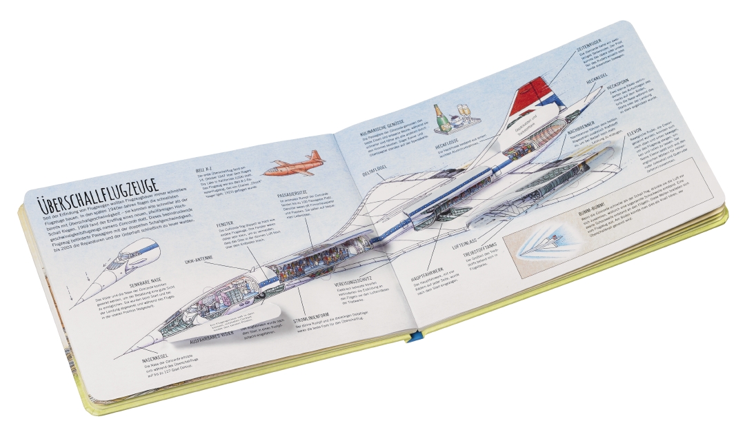 Start frei! Stephen Biesty stellt acht geniale Fluggeräte vor - von dem ersten Flugzeug, das den Ärmelkanal überquerte, bis zum spektakulären Space Shuttle. Doch das ist noch nicht alles: Unter den vielen Klappen verbirgt sich das faszinierende Innenleben von Flugzeug, Hubschrauber, Raumgleiter und Co. Dieses neue Papp-Klapp-Sachbilderbuch vom Meister der technischen Illustration wird kleine Flugzeugfans begeistern!
