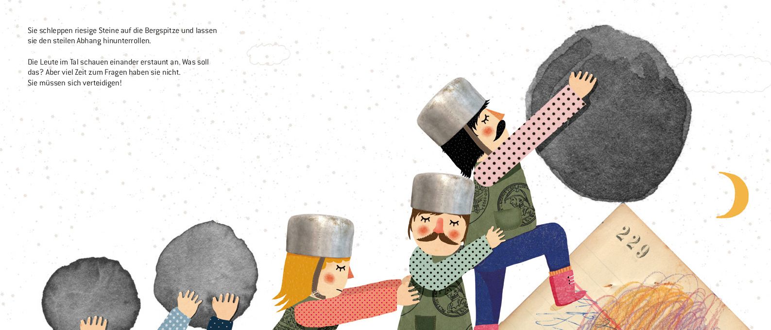 Ganz einfach erzählt das Buch von gewaltsamen Konflikten und ihrer absurden Logik, die naiven Illustrationen vertiefen den Kontrast zwischen Idylle und Zerstörung. Die Botschaft von Text und Bild ist klar: Selbstgerechtigkeit und fehlende Verständigung bringen jeden Frieden in Gefahr.