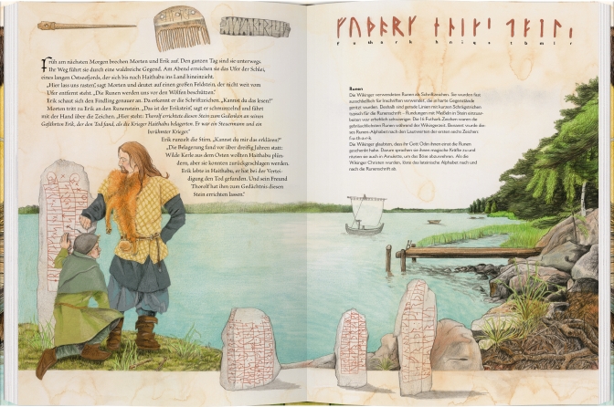 Ein Bauernhof an der Ostsee um das Jahr 1000: Vergeblich wartet der Wikingerjunge Erik auf die Rückkehr seines großen Bruders Leif, der sich vor vielen Monaten auf Vikingfahrt begeben hat. Als ein Skalde, ein reisender Dichter, des Weges kommt, macht Erik sich mit ihm auf nach Haithabu, der großen Hafenstadt, um dort nach seinem Bruder zu suchen. In diesem atmosphärischen Sachbilderbuch begleiten wir Erik auf seiner Reise und lernen das Leben der sagenumwobenen Nordmänner kennen, die entgegen ihrem Ruf nicht nur gefürchtete Plünderer, sondern zuallererst Bauern, Händler, Seeleute und Entdecker waren.