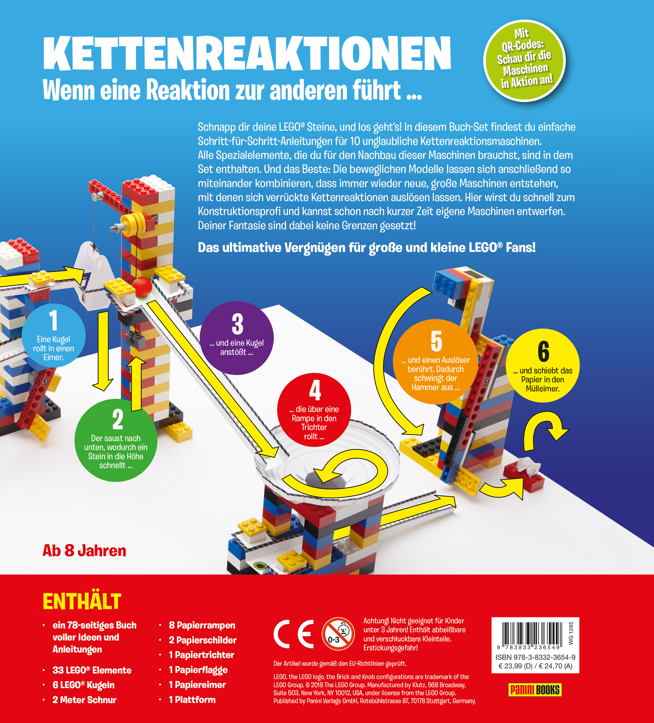 Schnapp dir deine LEGO® Steine, und los geht‘s! In diesem Buch-Set findest du einfache Schritt-für-Schritt-Anleitungen für 10 unglaubliche Kettenreaktionsmaschinen. Alle Spezialelemente, die du für den Nachbau dieser Maschinen brauchst, sind in dem Set enthalten. Und das Beste: Die beweglichen Modelle lassen sich anschließend so miteinander kombinieren, dass immer wieder neue, große Maschinen entstehen, mit denen sich verrückte Kettenreaktionen auslösen lassen. Hier wirst du schnell zum Konstruktionsprofi und kannst schon nach kurzer Zeit eigene Maschinen entwerfen. Deiner Fantasie sind dabei keine Grenzen gesetzt!