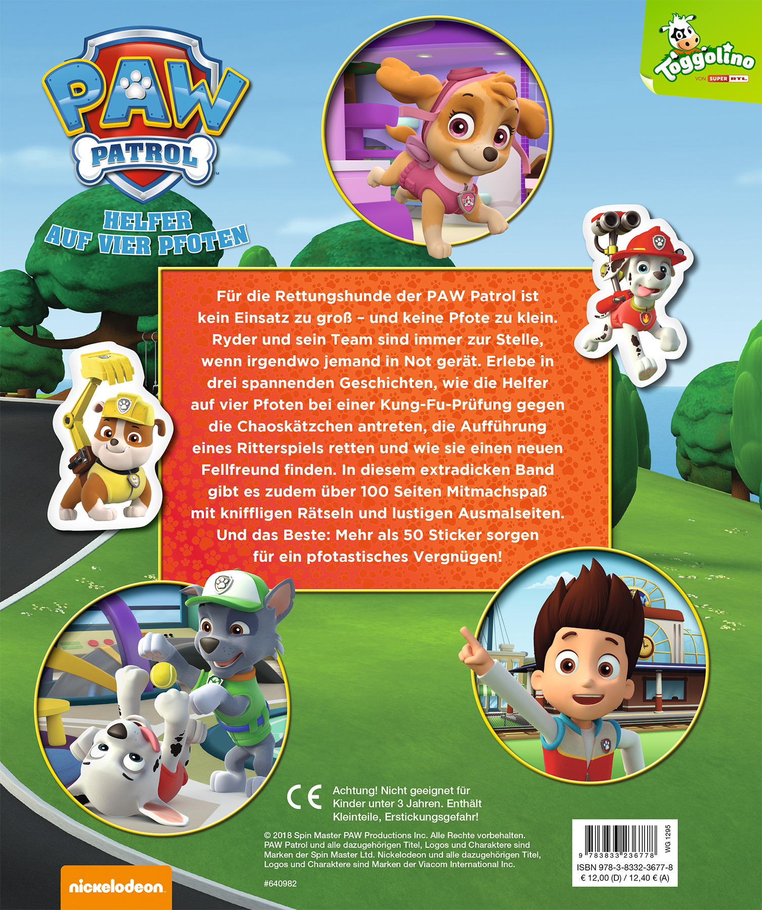 Für die Rettungshunde der PAW Patrol ist kein Einsatz zu groß - und keine Pfote zu klein. Ryder und sein Team sind immer zur Stelle, wenn irgendwo jemand in Not gerät. Erlebe in drei spannenden Geschichten, wie die Helfer auf vier Pfoten bei einer Kung-Fu-Prüfung gegen die Chaoskätzchen antreten, die Aufführung eines Ritterspiels retten und wie sie einen neuen Fellfreund finden.In diesem extradicken Band gibt es zudem über 100 Seiten Mitmachspaß mit kniffligen Rätseln und lustigen Ausmalseiten. Und das Beste: Mehr als 50 Sticker sorgen für ein pfotastisches Vergnügen!