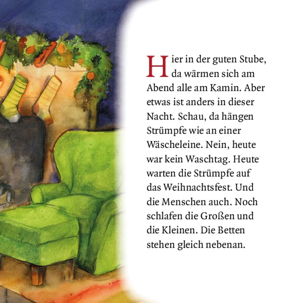 Es ist die Nacht vor Weihnachten. Alle im Haus scheinen zu schlafen außer Mary, dafür ist sie einfach zu aufgeregt. Plötzlich hört sie aus der Ferne leise Schlittenglöckchen und tatsächlich kommen da die Rentiere, angeführt von Rudolph, dem Rentier mit der roten Nase. Sie ziehen einen großen Schlitten, auf dem Santa Claus sitzt. Und schon im nächsten Augenblick steigt Santa Claus über das Dach und rutscht durch den Kamin in die Stube. Dort hängen die für ihn sorgsam aufgereihten Weihnachtsstrümpfe. In jede Socke steckt er ein Geschenk und ist dann auch schon wieder fort. Als Mary morgens wach wird, reibt sie sich die Augen: Hat sie das alles nur geträumt?