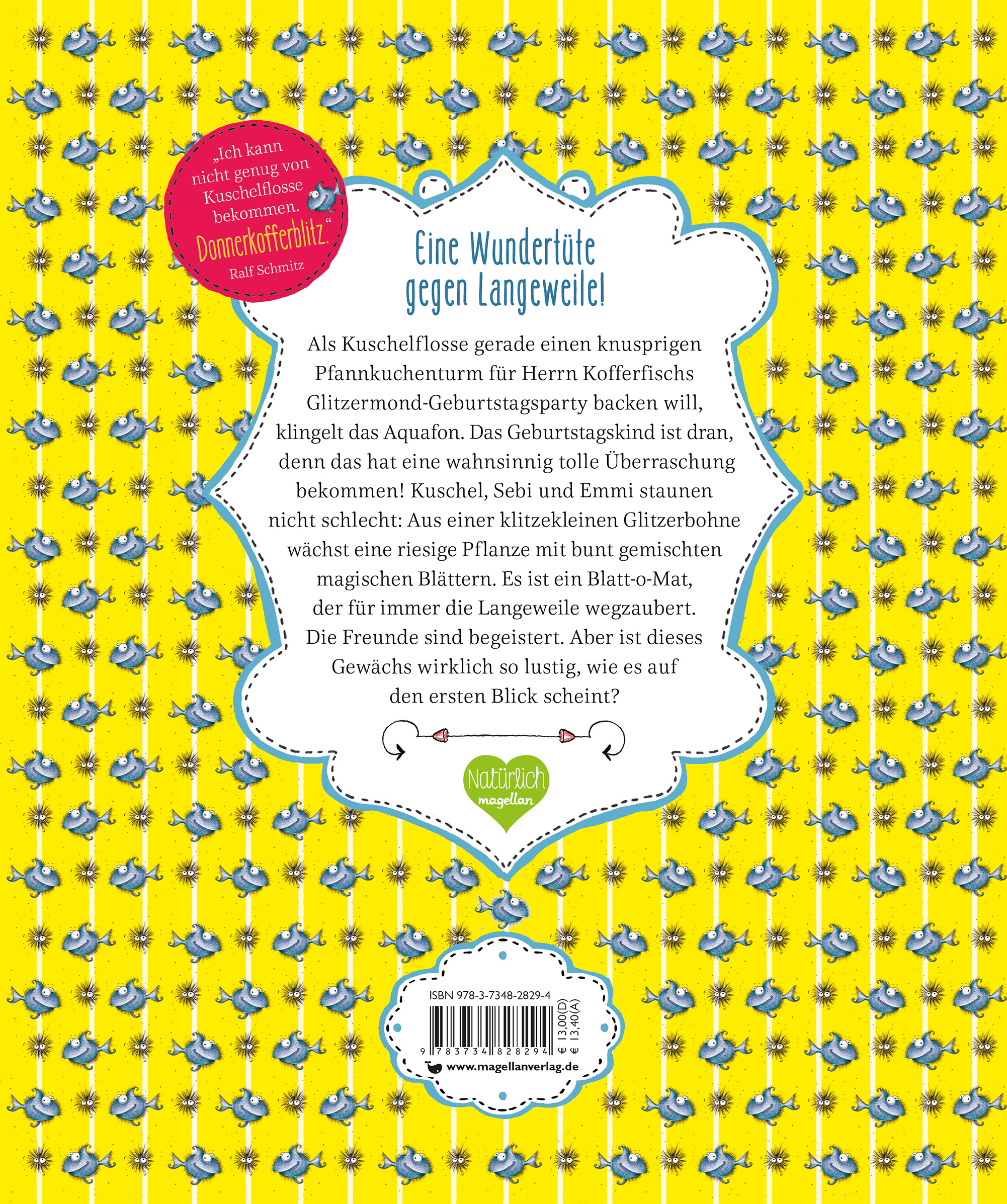Als Kuschelflosse gerade einen knusprigen Pfannkuchenturm für Herrn Kofferfischs Glitzermond-Geburtstagsparty backen will, klingelt das Aquafon. Das Geburtstagskind ist dran, denn es hat eine wahnsinnig tolle Überraschung bekommen! Kuschel, Sebi und Emmi staunen nicht schlecht: Aus einer klitzekleinen Glitzerbohne wächst eine riesige Pflanze mit bunt gemischten, magischen Blättern. Es ist ein Blatt-o-Mat, der für immer die Langeweile wegzaubert. Die Freunde sind begeistert. Aber ist dieses Gewächs wirklich so lustig, wie es auf den ersten Blick scheint?