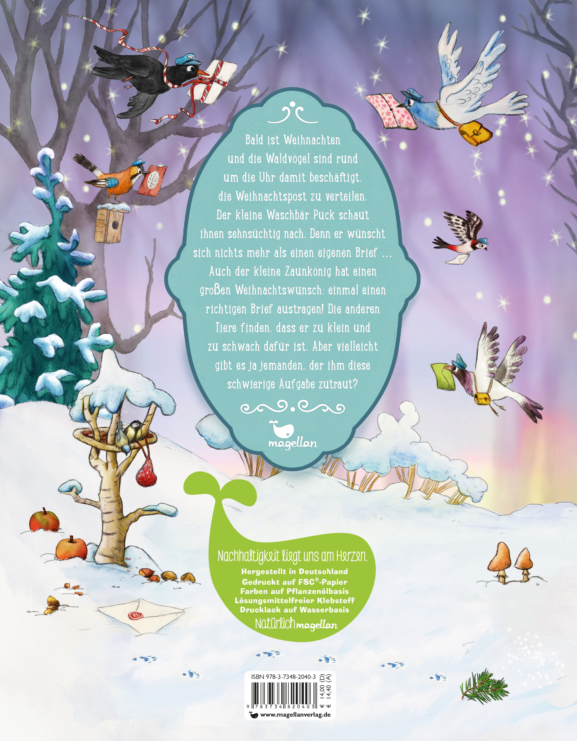 Bald ist Weihnachten und die Waldvögel sind rund um die Uhr damit beschäftigt, die Weihnachtspost zu verteilen. Der kleine Waschbär Puck schaut ihnen sehnsüchtig nach. Denn er wünscht sich nichts mehr als einen eigenen Brief ...Auch der Zaunkönig hat einen großen Weihnachtswunsch: einmal einen richtigen Brief austragen! Die anderen Tiere finden, dass er zu klein und zu schwach dafür ist. Aber vielleicht gibt es ja doch jemanden, der ihm diese schwierige Aufgabe zutraut?