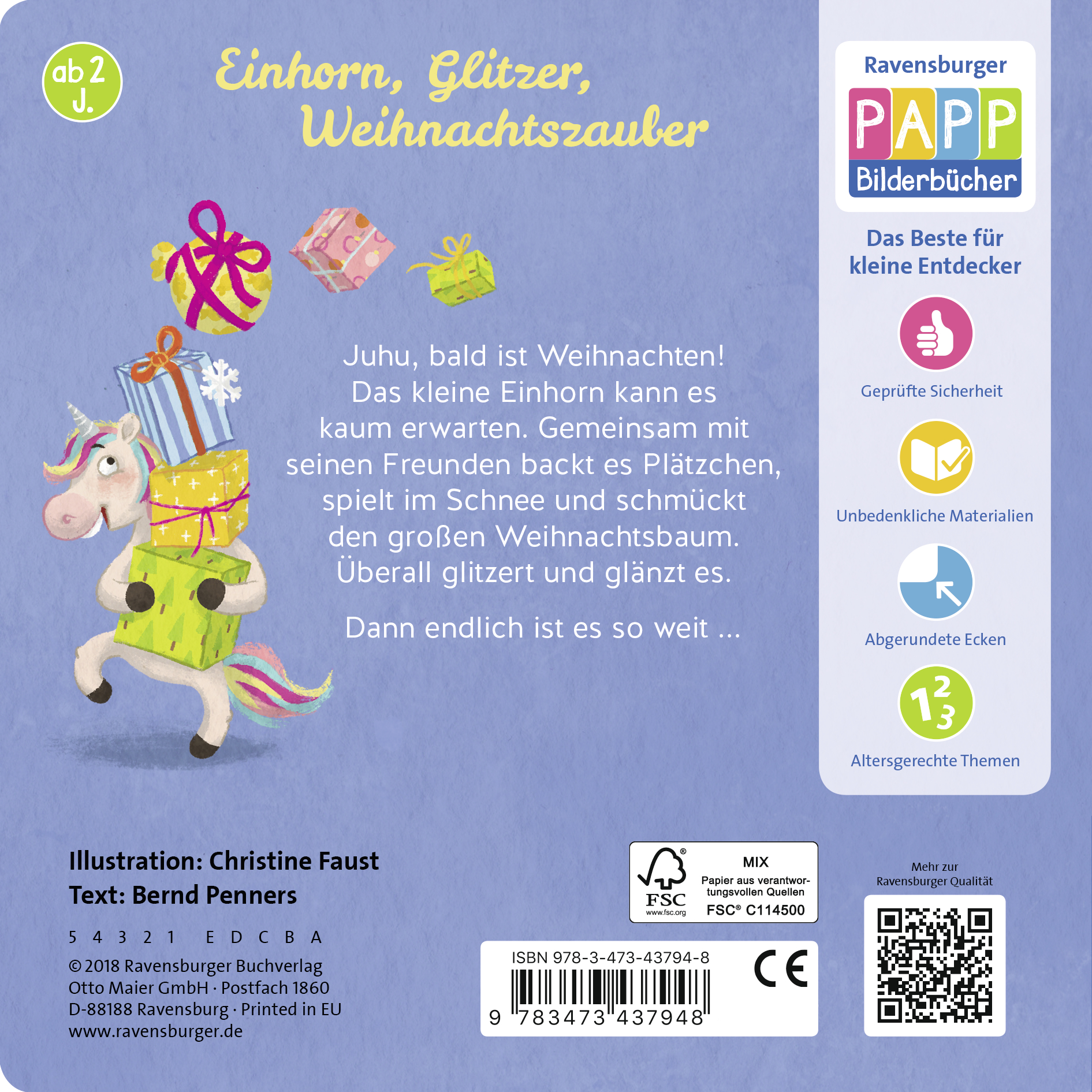 Juhu, bald ist Weihnachten! Das Einhorn kann es kaum erwarten. Zum Glück gibt es noch viel zu tun, um die Wartezeit zu verkürzen: Weihnachtsbaum schmücken, Plätzchen backen und Geschenke verpacken. Mit lustigen Reimen und tollem Glitzereffekt.