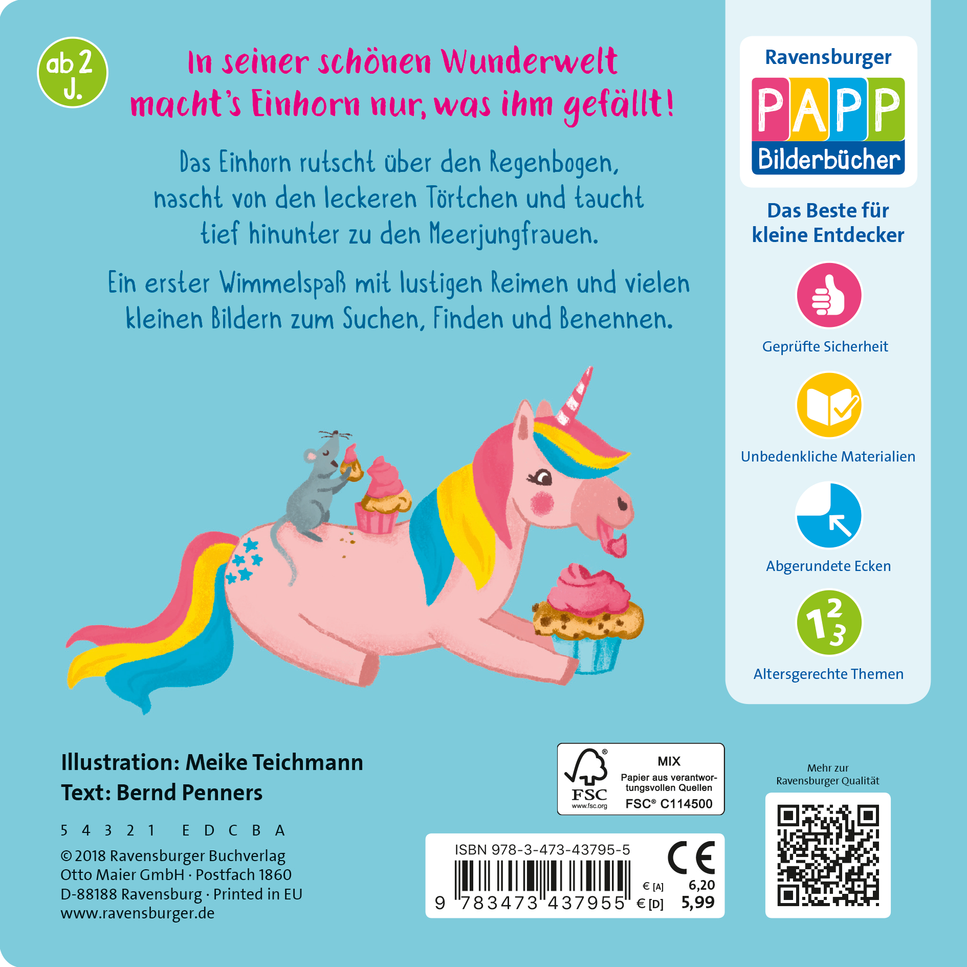 Das kleine Einhorn rutscht über den Regenbogen, fliegt an bunten Ballons umher und besucht die Meerjungfrauen. Lustige Reime begleiten es dabei und animieren Kinder dazu, viele Vignetten im Bild wiederzufinden. So macht Sprechen lernen Spaß!