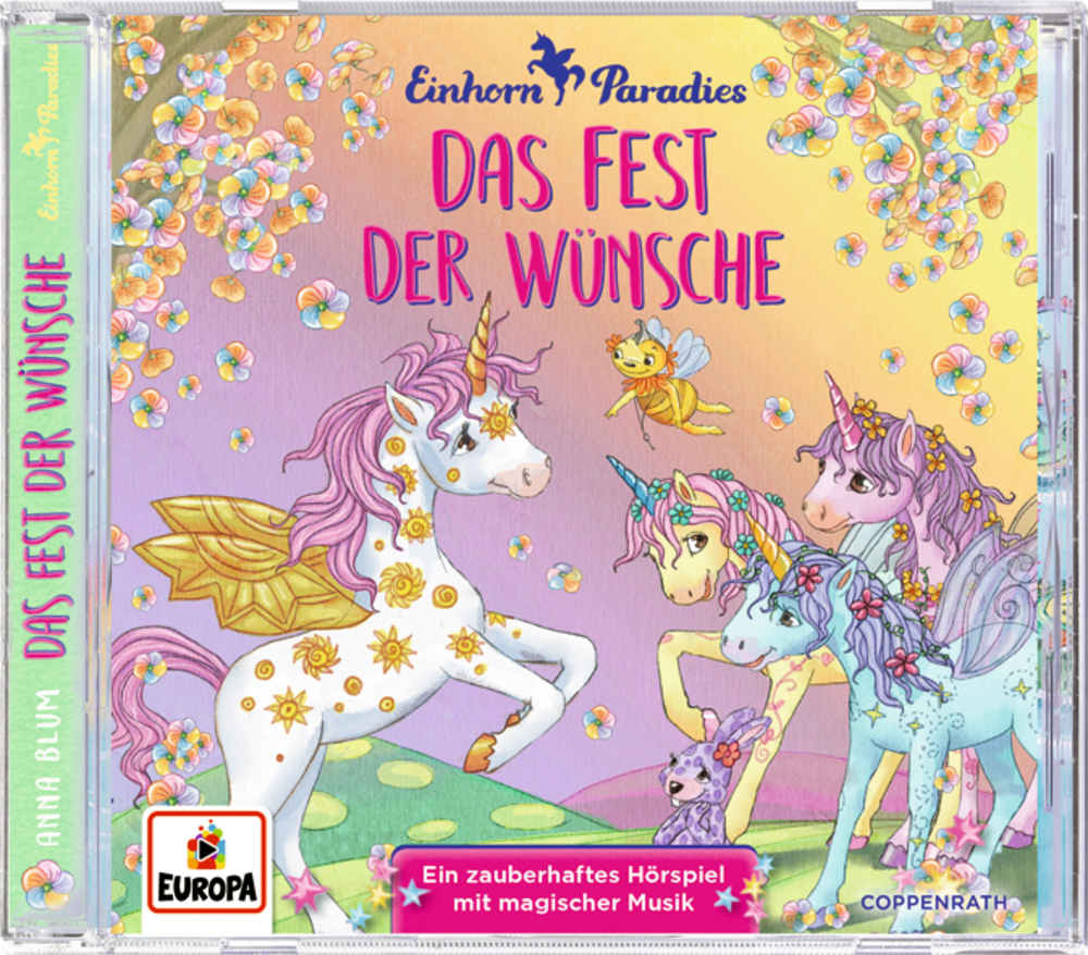 Einmal im Jahr - wenn der Wunschbaum in allen Farben des Regenbogens blüht - findet im Einhorn-Paradies ein großes Fest statt. Dann darf jeder Inselbewohner dem Baum seinen allergrößten Wunsch zuflüstern, denn für jeden gibt es eine Blüte am Baum, einen Wunsch, der in Erfüllung gehen kann.Doch mitten auf dem Fest machen die drei kleinen Einhörner Vanilla, Rosie und Blue eine schreckliche Entdeckung: Ausgerechnet die drei Blüten, die für sie bestimmt waren, sind spurlos verschwunden!Da bietet Suria, das goldene Einhorn vom Lichthügel, ihre Hilfe an. Wird sie mit ihrem besonderen Spürsinn für Schätze, das Einhornfest retten können?Teil 3 der märchenhaften Hörspiel-Reihe vom Traditionslabel EUROPA, umgesetzt mit vielen magischen Liedern zum Mitsingen! Für kleine und große Einhorn-Fans ab vier Jahren!
