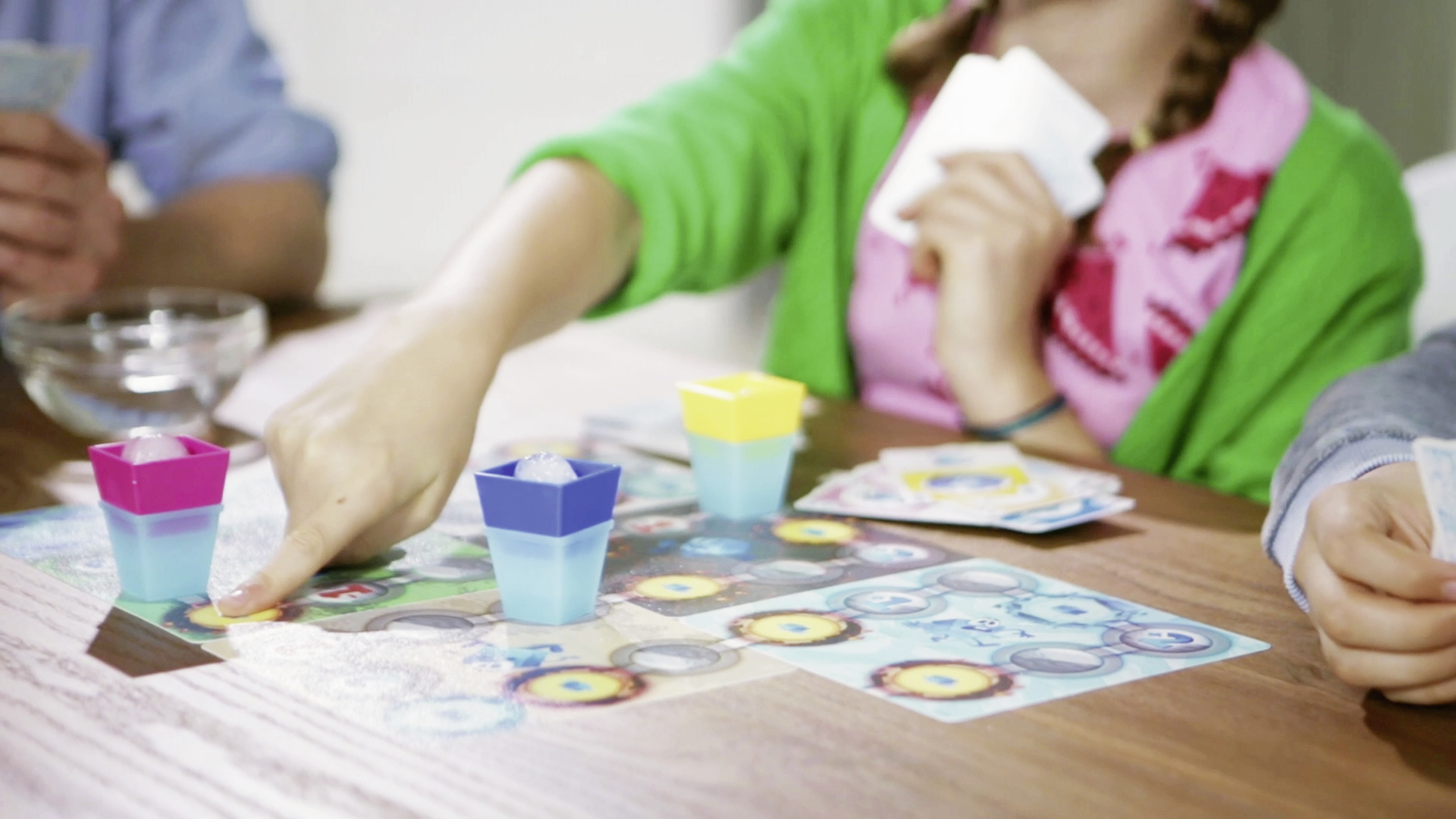 Inhalt: 4 Becher-Oberteile, 8 Becher-Unterteile, 6 wasserfeste Spielplanteile, 60 Karten, 1 Pipette