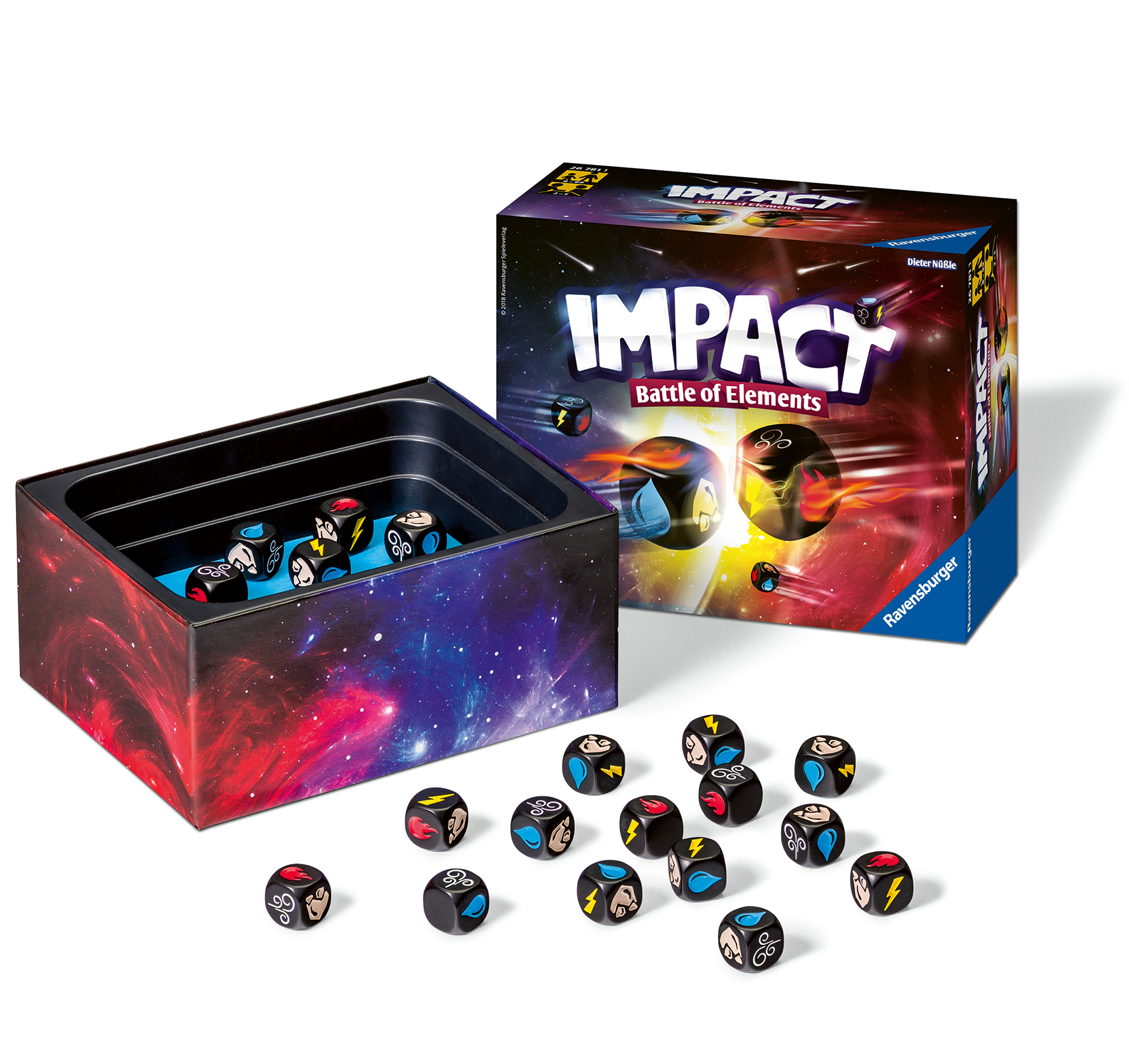 Bei IMPACT kracht es richtig! Reihum feuern die Spieler ihre Elementwürfel in die Arena. Ihr Ziel ist es, möglichst viele Würfel umzustoßen, um die Elemente zu ändern. Nur wenn viele gleiche Elemente in der Arena liegen, erhaltet ihr Würfel zurück. Wer zuletzt Würfel übrig hat, gewinnt. Einfache Regeln und tolle Würfel machen Impact zu einem Spiel, das in jeder Runde einschlägt! Spiel-Inhalt: 26 Elementwürfel, 1 Würfelarena, 1 Matte. Spieleranzahl: 2-5. Spieldauer: 15 Min. Spieleanleitung in deutsch, niederländisch, französisch, italienisch, englisch.