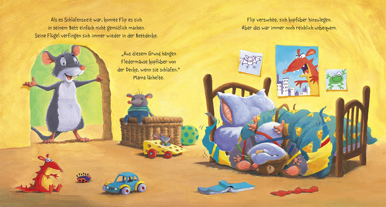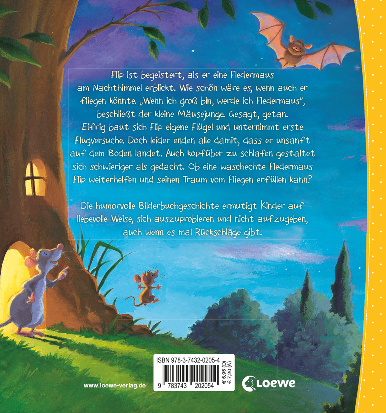 Flip ist begeistert, als er eine Fledermaus am Nachthimmel erblickt. Wie schön wäre es, wenn auch er fliegen könnte. Wenn ich groß bin, werde ich Fledermaus, beschließt der kleine Mäusejunge. Gesagt, getan. Eifrig baut sich Flip eigene Flügel und unternimmt erste Flugversuche. Doch leider enden alle damit, dass er unsanft auf dem Boden landet. Auch kopfüber zu schlafen gestaltet sich schwieriger als gedacht. Ob eine waschechte Fledermaus Flip weiterhelfen und seinen Traum vom Fliegen erfüllen kann?