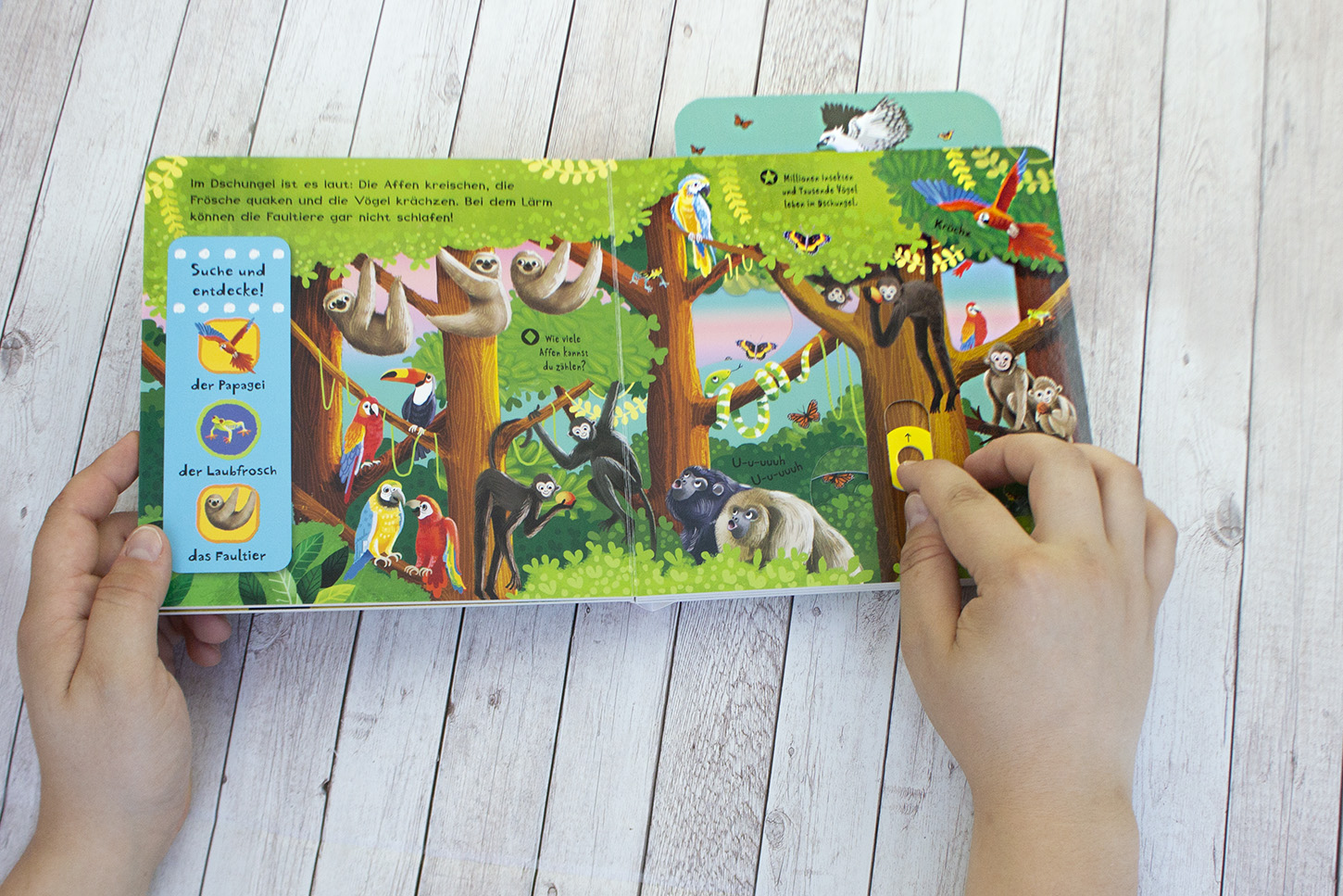 Probiere die Schiebeeffekte aus und finde heraus, was es im Dschungel alles zu entdecken gibt.