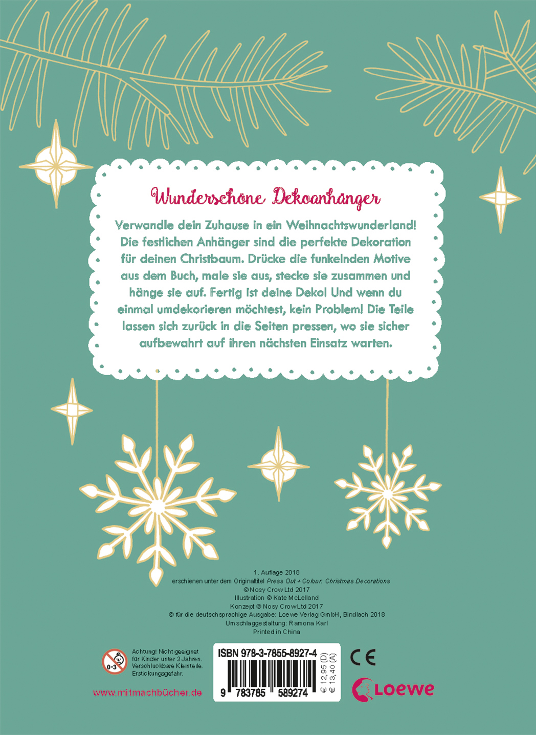Drücke die funkelnden Motive aus dem Buch, male sie aus, stecke sie zusammen und hänge sie auf. Fertig ist deine Deko! Und wenn du einmal umdekorieren möchtest, kein Problem! Die Teile lassen sich zurück in die Seiten pressen, wo sie sicher aufbewahrt auf ihren nächsten Einsatz warten.