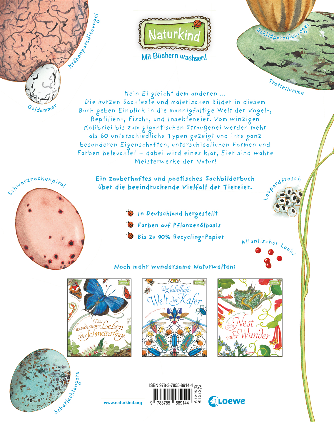 Die kurzen Sachtexte und malerischen Bilder in diesem Buch geben Einblick in die mannigfaltige Welt der Vogel-, Reptilien-, Fisch-, und Insekteneier. Vom winzigen Kolibriei bis zum gigantischen Straußenei werden mehr als 60 unterschiedliche Typen gezeigt und ihre ganz besonderen Eigenschaften, unterschiedlichen Formen und Farben beleuchtet - dabei wird eines klar, Eier sind wahre Meisterwerke der Natur!
