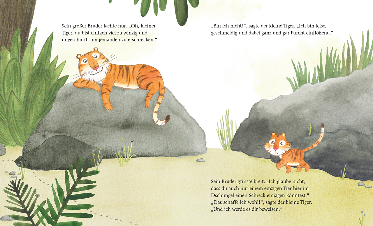 Ein jeder im Dschungel weiß, dass Tiger leise, geschmeidige und dabei ganz und gar furchteinflößende Tiere sind - na ja, bis auf den kleinen Tiger. Vor dem hat nämlich niemand Angst. Er ist einfach viel zu winzig und ungeschickt, um jemanden zu erschrecken.