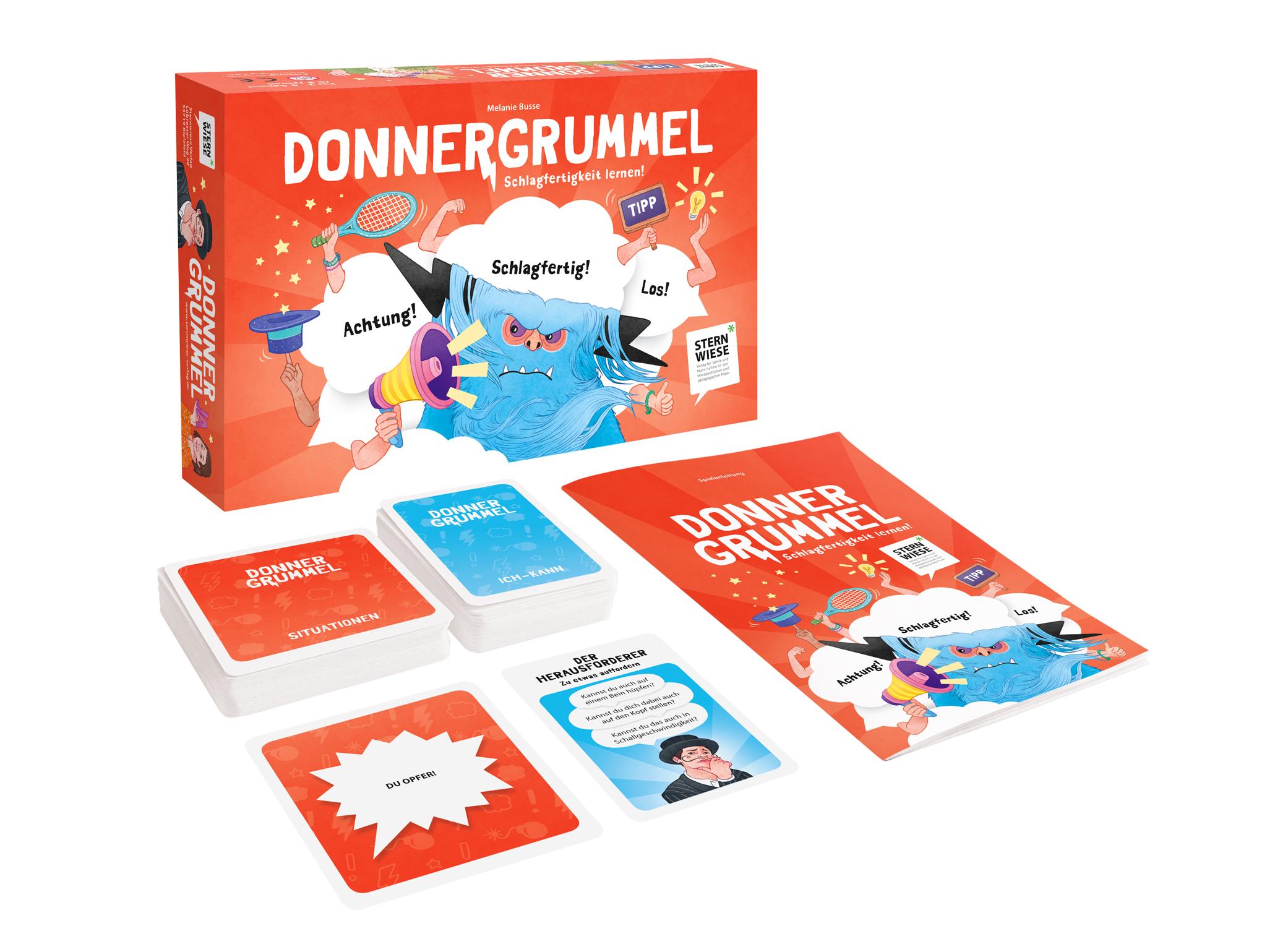 Donnergrummel ist ein Spiel, mit dem du Schlagfertigkeit lernen und trainieren kannst. Um der Gefahr des „Donnergrummels“ zu entkommen, sorgen Mr. Coolman, der Lobinator, der Trickspieler und viele andere für gute Ideen. Und wenn du den Donnergrummel im richtigen Moment entlarvst, kann er sogar beim Gewinnen helfen. Lernen entwaffnend zu reagieren!