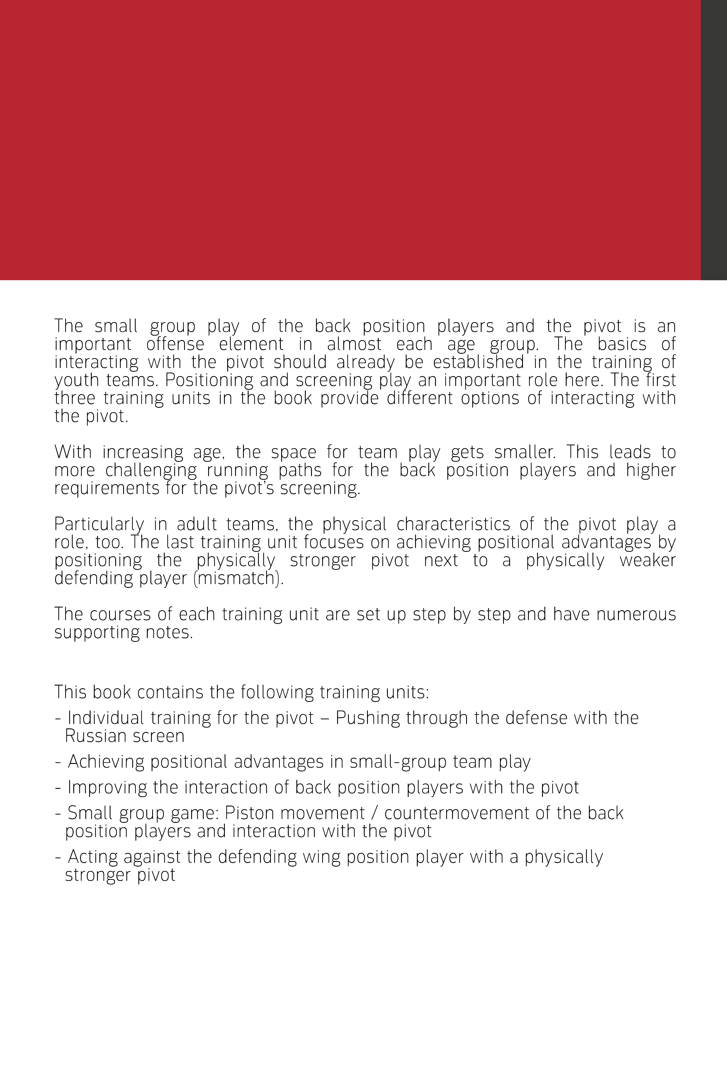 This training unit focuses on the interaction of the back position players with each other regarding piston movement/countermovement and passing to the pivot. Following warm-up, the back position players take the first methodical step regarding the interaction with the pivot during the ball familiarization phase. During the goalkeeper warm-up shooting and a subsequent offense exercise, the players practice the piston movement/countermovement which should result in a shot. In the following two small group exercises, the players stepwise further develop their piston movement/countermovement and the interaction with the pivot. The final exercise combines the different elements that the players practiced before with an initial action and creative continuous playing.