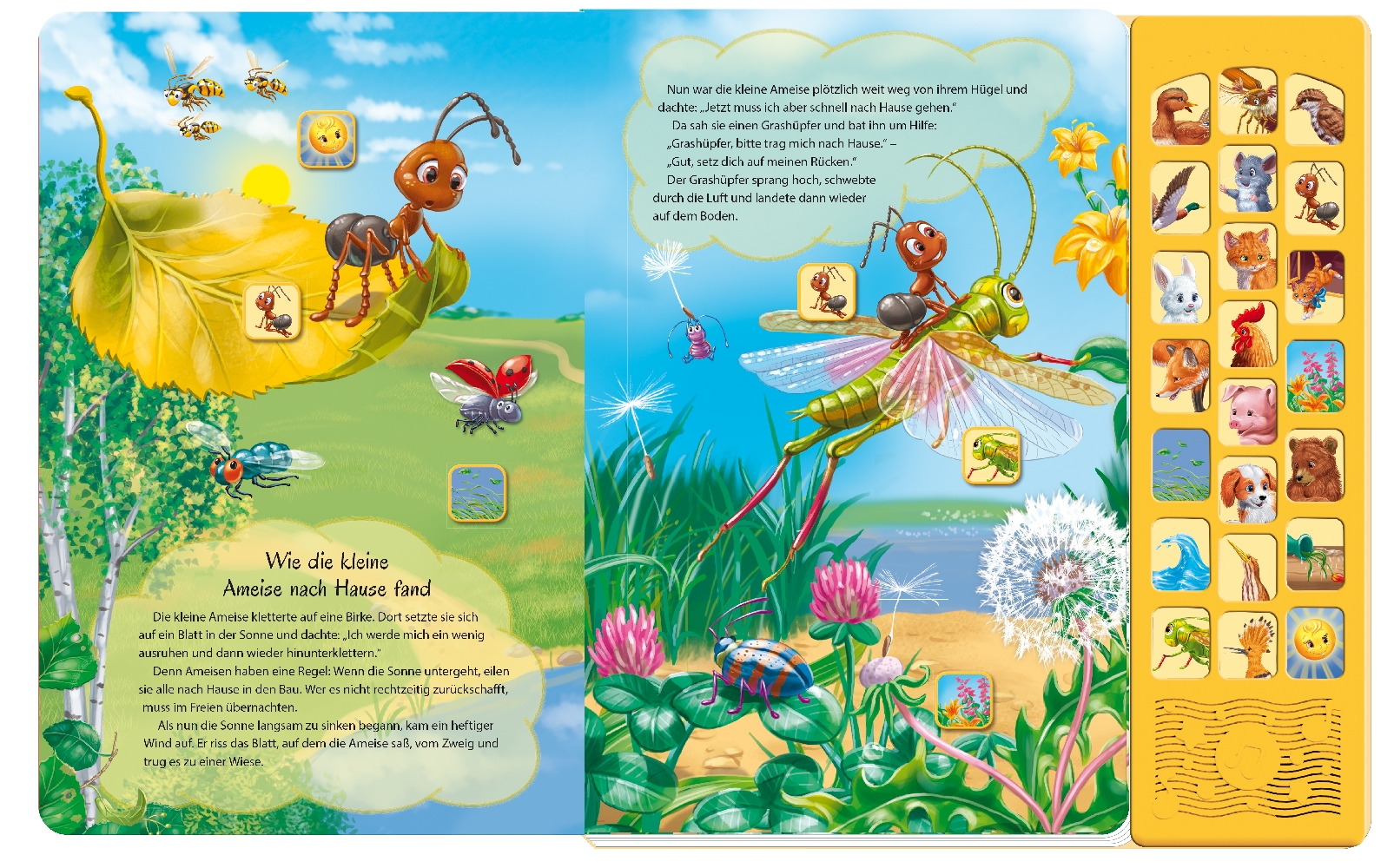 Fünf lehrreiche Geschichten für kleine Tierfreunde zum Anschauen und Zuhören! Liebenswert gezeichnete Figuren, zahlreiche Details und 22 verschiedene Geräusche lassen die Geschichten beinahe lebendig werden.Inhalt: Der kleine Pechvogel - Wie die Ameise nach Hause fand - Wie die Maus sich selbst überlistete - Auf der Jagd - Vom Kätzchen, das unbedingt erwachsen sein wollte.Es sind 3 austauschbare Batterien enthalten.