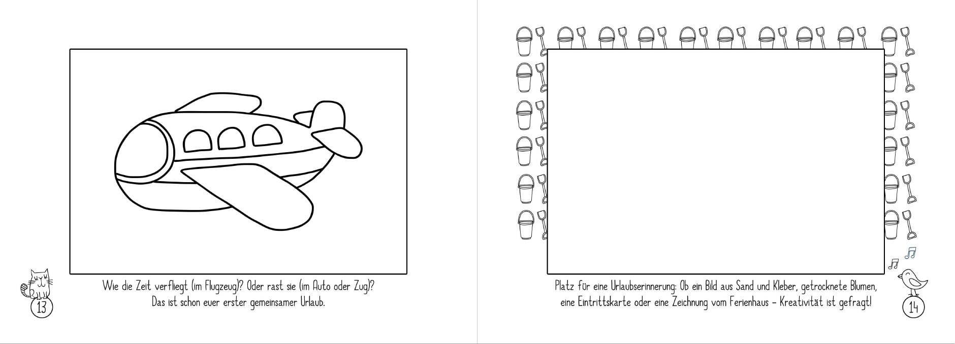 Das geheftete Büchlein im Din A5 Format mit Softcover enthält neben ausreichend Platz für Geschwister-Fotos z. B. beim ersten Kennenlernen, dem ersten gemeinsamen Urlaub oder dem ersten Weihnachtsfest auch einige Aktionsseiten. So können z. B. Hand-Abdrücke verewigt und lustige Fingerabdruck-Tierchen gestempelt werden. Oder es werden Urlaubserinnerungen als Gemälde bzw. Bastelarbeit festgehalten. Und Essens-Kleckse werden mit Wasserfarben aufs Papier gebracht. Mit insgesamt 30 Seiten für Fotos, Texte und Mal- und Bastel-Spaß ergibt dies einen richtigen Erinnerungsschatz, den jedes Geschwisterkind bestimmt auch als Erwachsener einmal gerne wieder in die Hand nehmen und durchblättern wird.