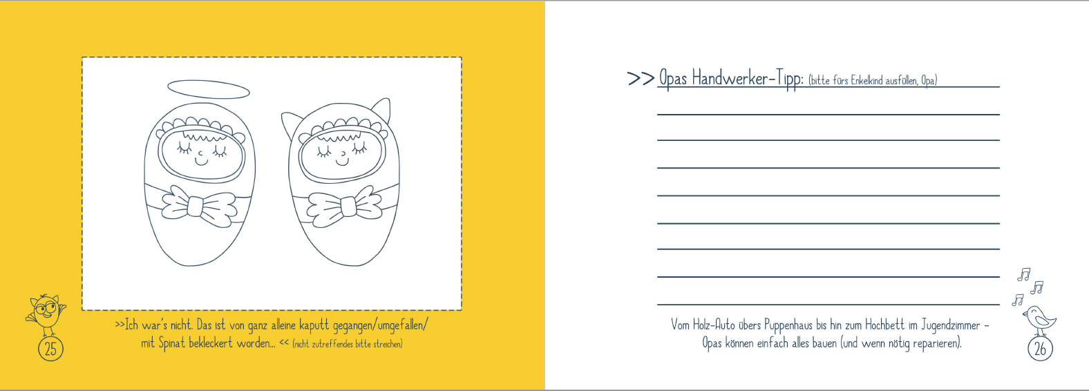 Die Eintrage- und Aktions-Seiten beginnen bereits bei der Schwangerschaft und halten z. B. fest wann und wie der Opa von dem Enkelchen erfahren hat. Außerdem kann z. B. ein Fußabdruck des Enkelkindes in dem Buch verewigt werden oder ältere Kinder malen ein Bild für den Opi. Umgekehrt darf Opa einen nützlichen Handwerker-Tipp für das Enkelkind in das Buch schreiben. (Das Buch ist also auch eine schöne Erinnerung für das Enkelkind - daher am besten gleich zwei Exemplare kaufen: eins für Opa, eins fürs Enkelchen). Und nicht zuletzt darf ausgefüllt werden, warum Opa, der allerbeste Opa der Welt ist. Dieser Abschluss und das Buch an sich sind wohl die schönste Liebeserklärung, die ein Opa bekommen kann!