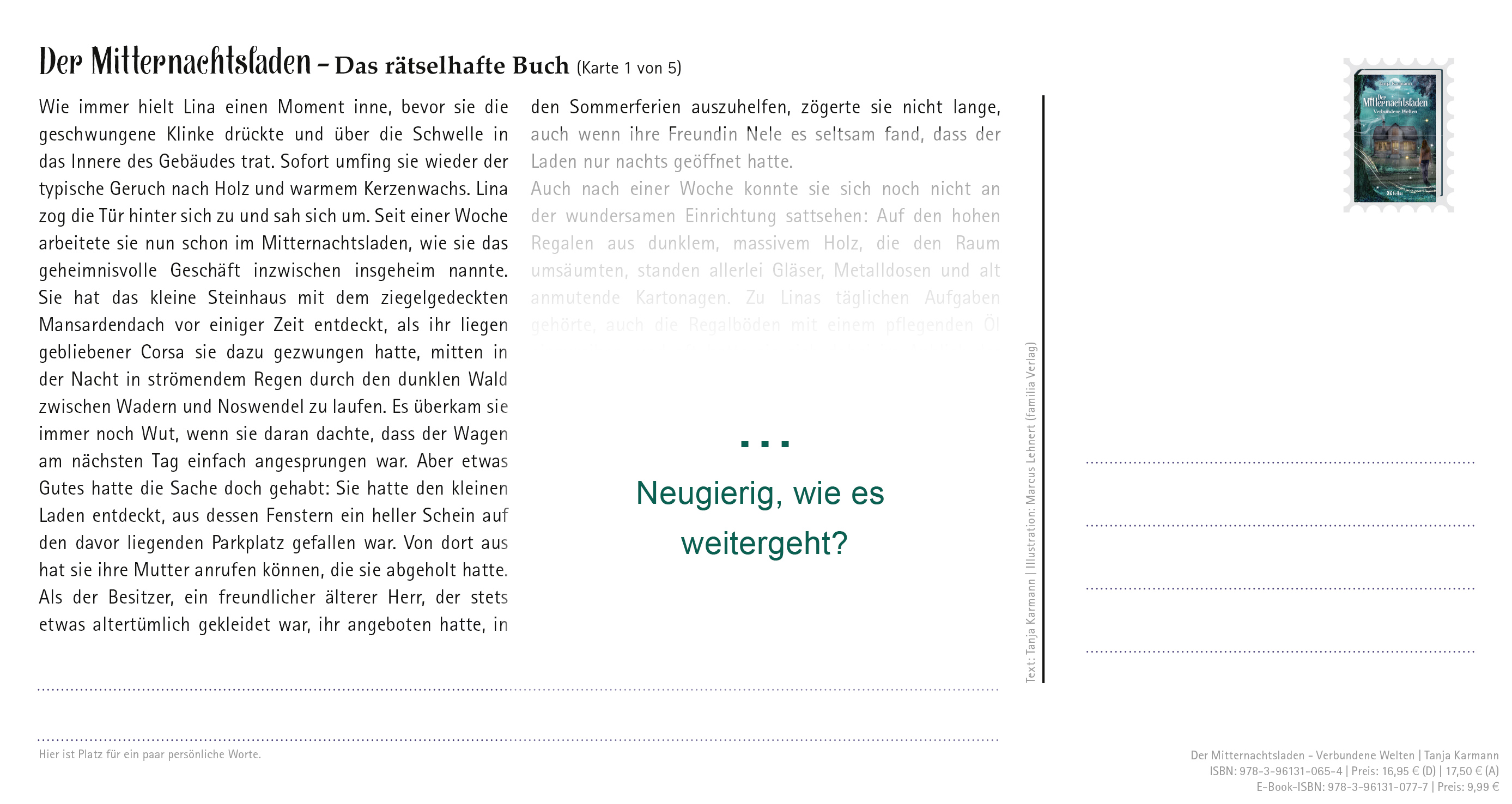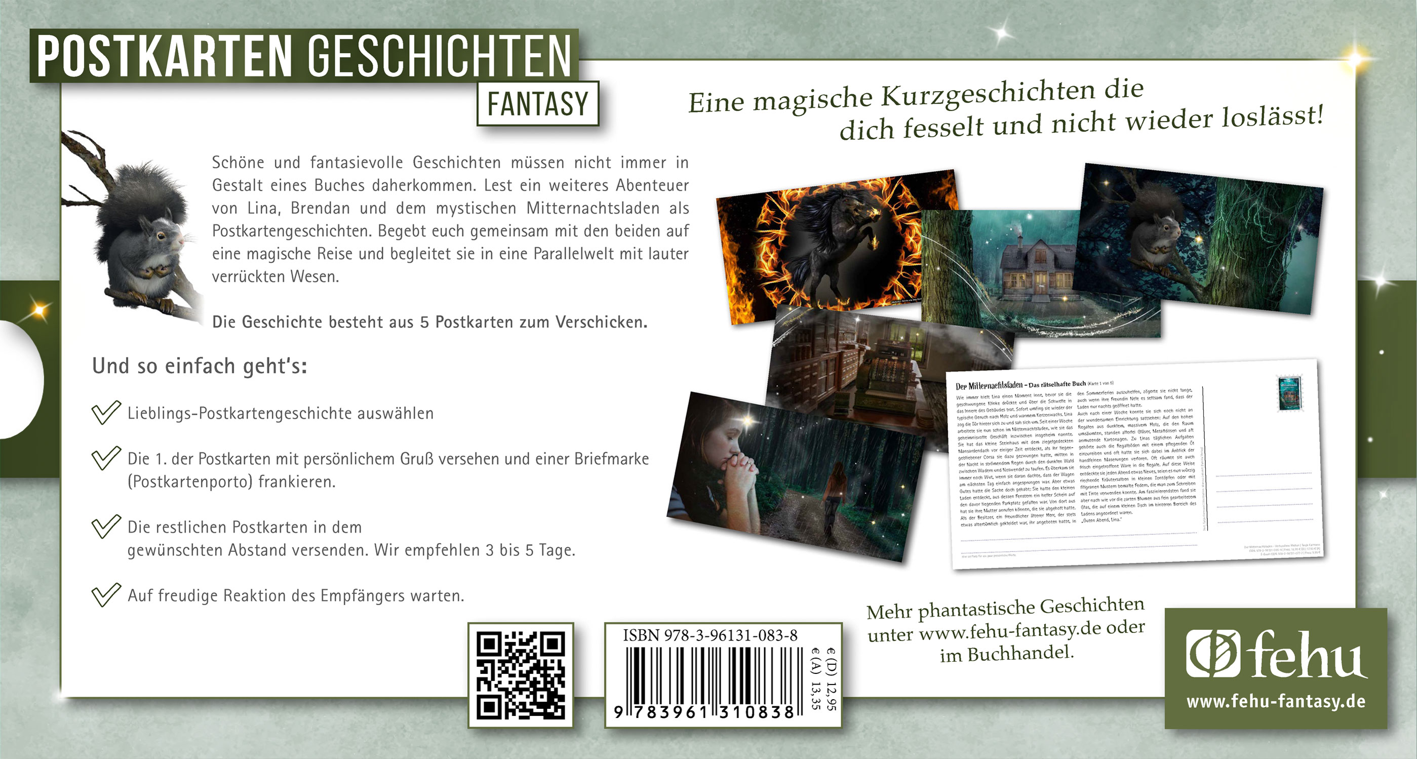 Grüß Deine Lieben mit 5 fantasievoll illustrierten Postkarten, die eine Episode aus dem mystischen MITTERNACHTSLADEN erzählen. Schöne und fantasievolle Geschichten müssen nämlich nicht immer in Gestalt eines Buches daherkommen. Erlebe Linas und Brendans Welt – diesmal als Postkartengeschichte. Begib dich gemeinsam mit den beiden auf eine magische Reise und begleite sie in eine Parallelwelt mit diversen faszinierenden Wesen.