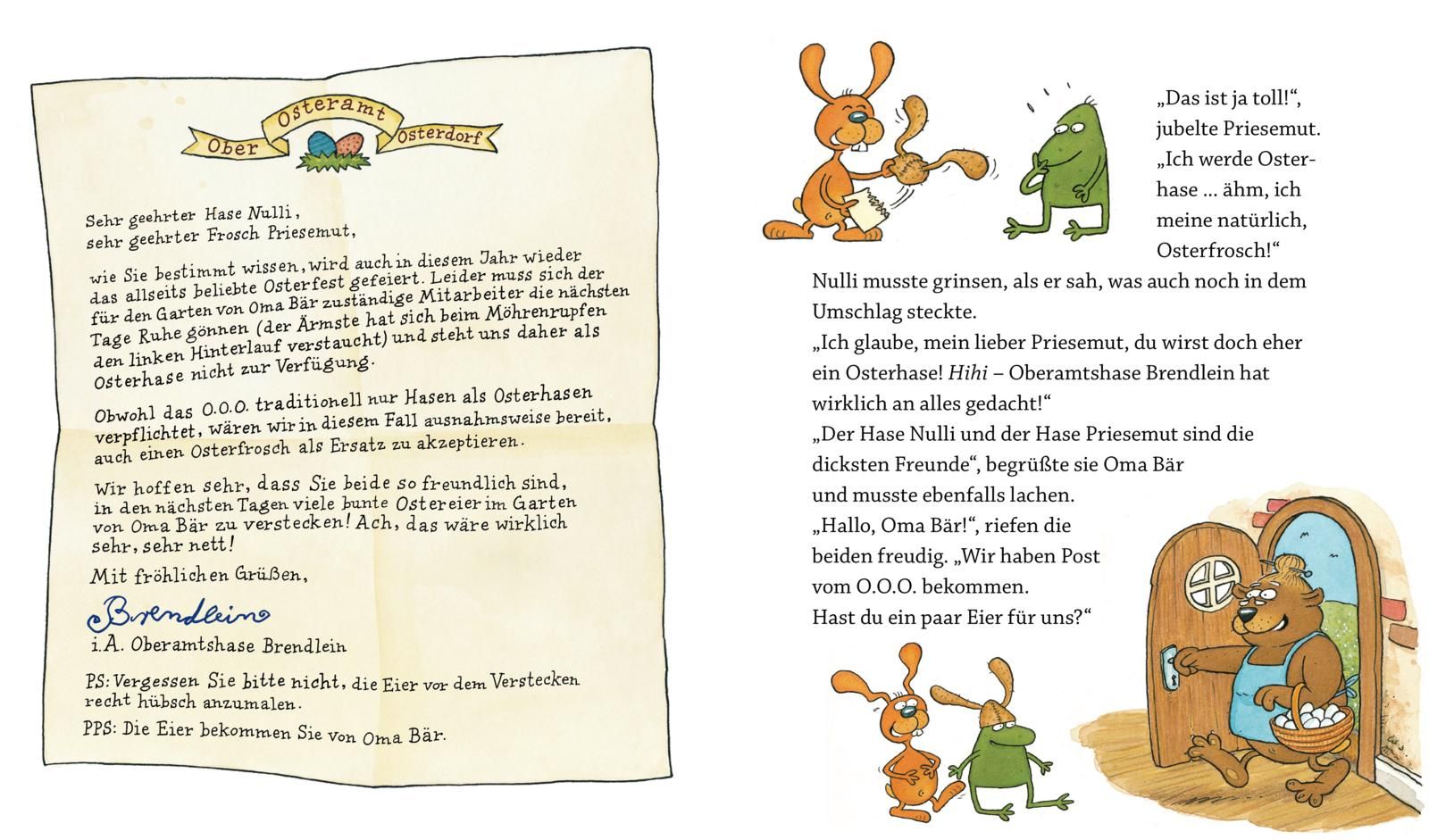 Kurz vor Ostern bekommen Nulli & Priesemut einen supereiligen Eilbrief. Darin fragt das Oberosteramt den Hasen Nulli und dessen besten Freund, den Frosch Priesemut, ob sie bereit wären, kurzfristig für den verletzten Osterhasen einzuspringen und im Garten von Oma Bär Ostereier zu verstecken. Und so kommt es, dass sich Nulli und Priesemut vergnügt an die Arbeit machen ...