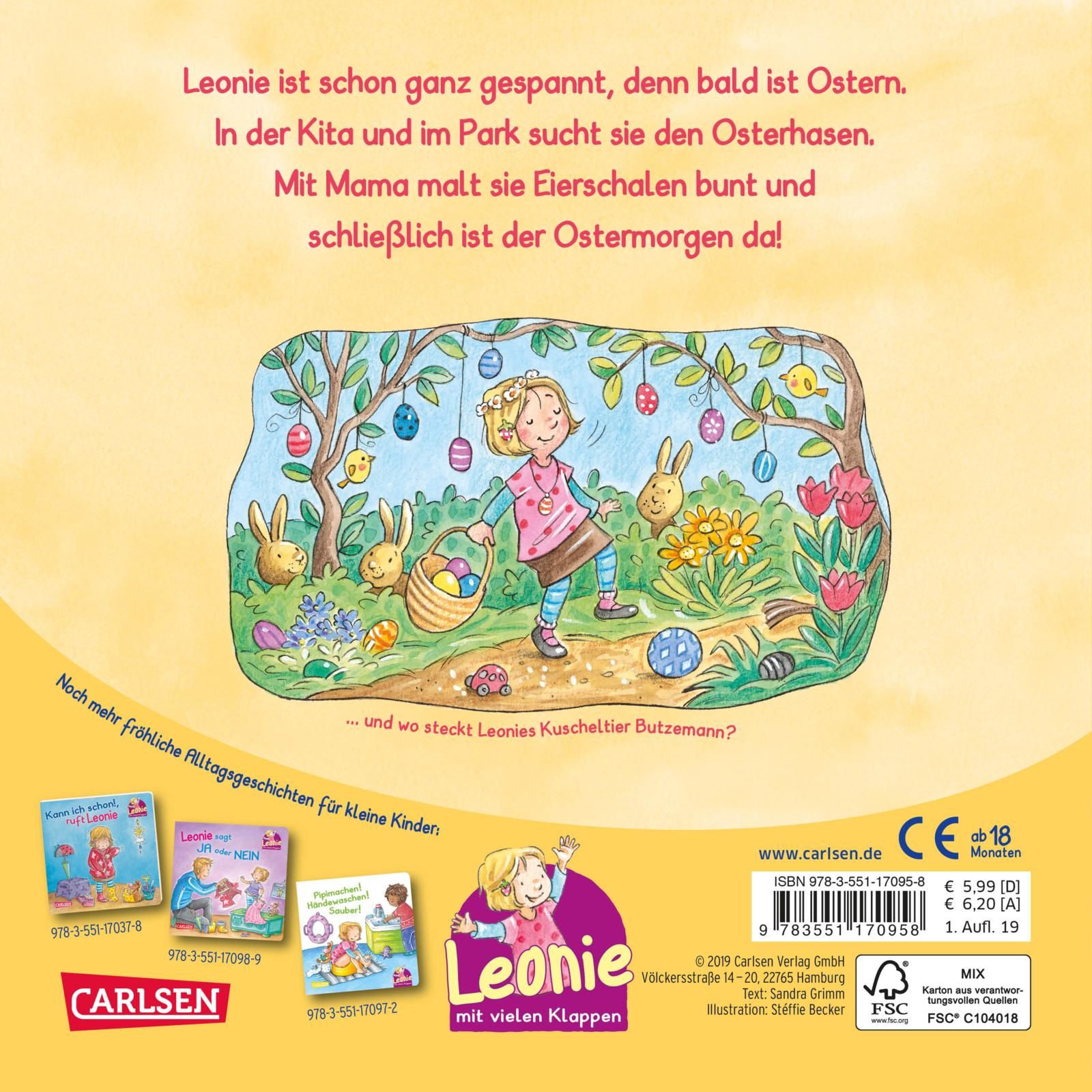 In der Kita tollt sie durch die Blumenwiese und hält neugierig Ausschau, ob die Ostereier vielleicht schon früher versteckt wurden. Mit Mama malt sie Eierschalen bunt und schenkt Oma ein hübsches Osterei. Beim Picknick im Park macht sich Leonie mit ihrer besten Freundin auf die Suche nach dem Osterhasen. Und schließlich ist der Ostermorgen da! Leonie findet viele kleine Osternester, Papa spielt mit ihr und Malte Eierlaufen und dann lassen sich alle das gemeinsame Osterfrühstück in der Sonne schmecken.