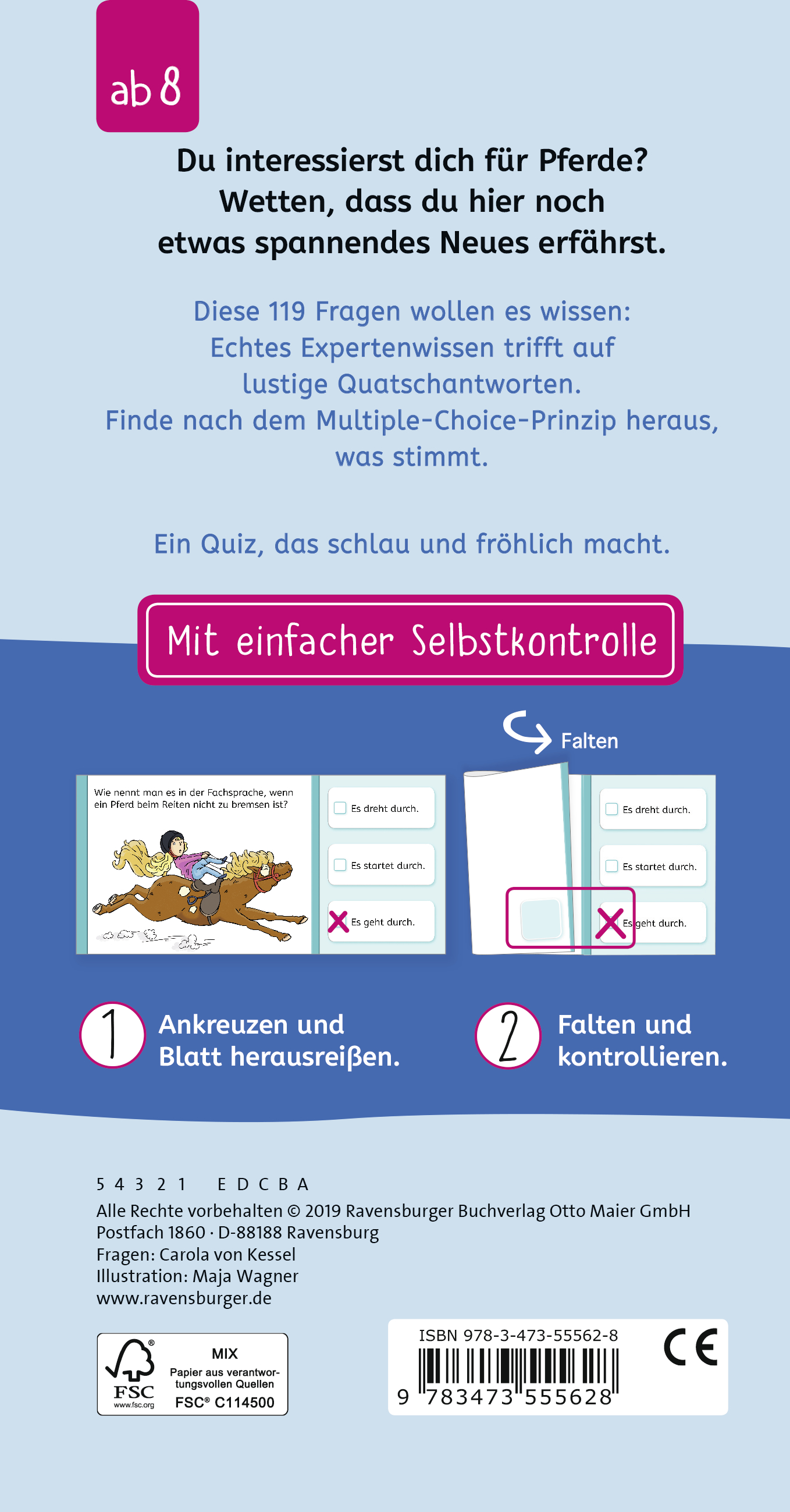Hier können Pferdefreunde ihr Wissen testen und Neues rund ums Thema Pferd lernen. Blatt für Blatt gilt es, Fragen im multiple-choice-System zu beantworten. Zur richtigen Lösung gibt es immer einen erklärenden Text. Dank seines handlich-schmalen Formats ist der Block auch der ideale Reisezeitverkürzer für unterwegs.