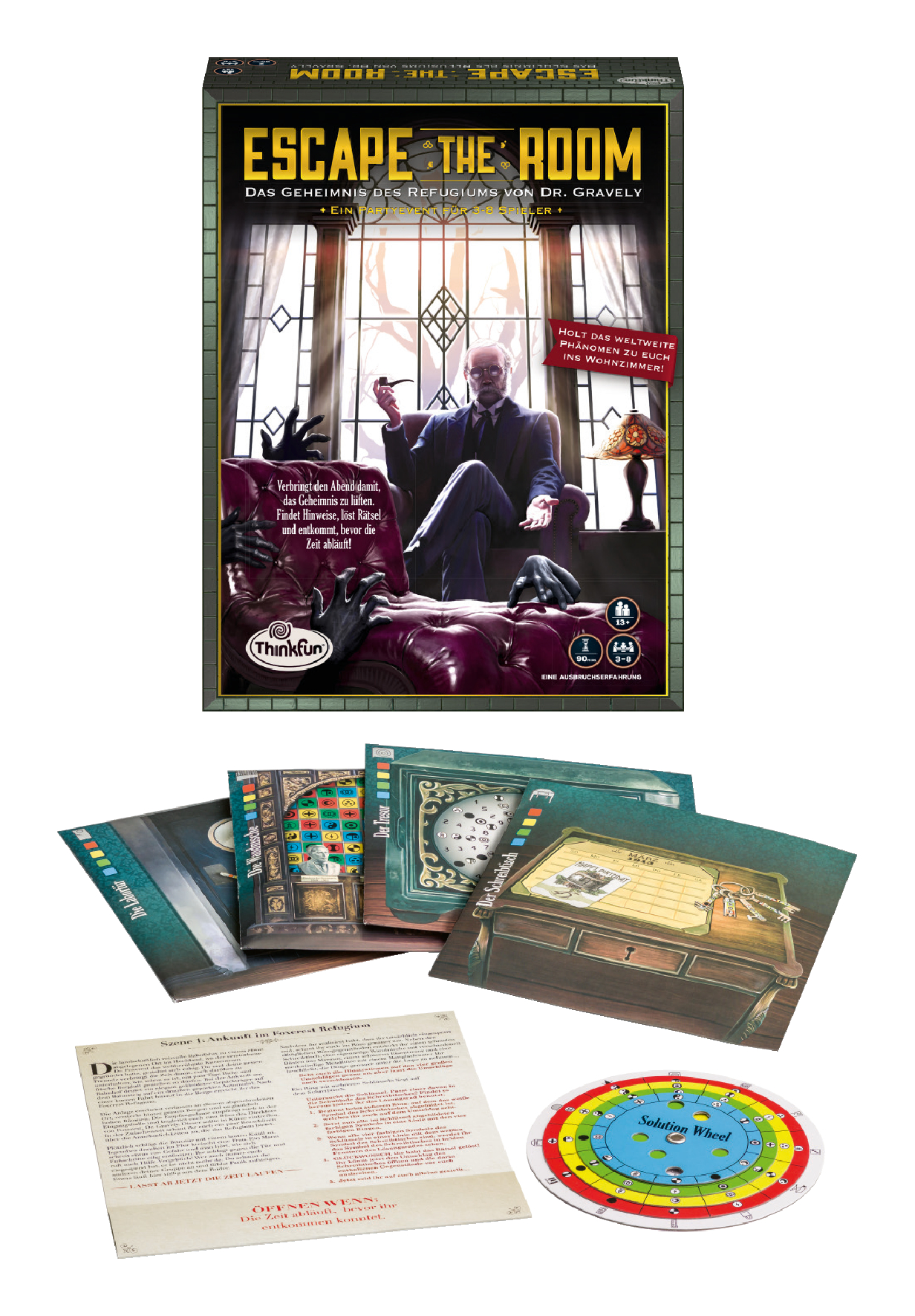 Wir schreiben das Jahr 1913: Die Spielergruppe hat einen kostenlosen Aufenthalt im Foxcrest Refugium gewonnen, in dem sich der berühmte Dr. Gravely einen Namen für Kuranwendungen und Erholungsmöglichkeiten für die bessere Gesellschaft gemacht hat. Doch der „Kurort“, in dem die Kurgäste ihre Erholung genießen wollen, scheint kein gewöhnlicher Kurort zu sein, sondern etwas ganz Anderes … Die Spieler erleben ein spannendes Abenteuer, in dem sie eingesperrt werden! Können sie rechtzeitig aus dem Refugium entkommen und das mysteriöse Rätsel lösen? Spiel-Inhalt: 11 Szenariokarten, 4 versiegelte Umschläge mit geheimen Gegenständen, 1 Lösungsrad. Spieleranzahl: 3-8. Spieldauer: 90 Min. Spieleanleitung in deutsch.