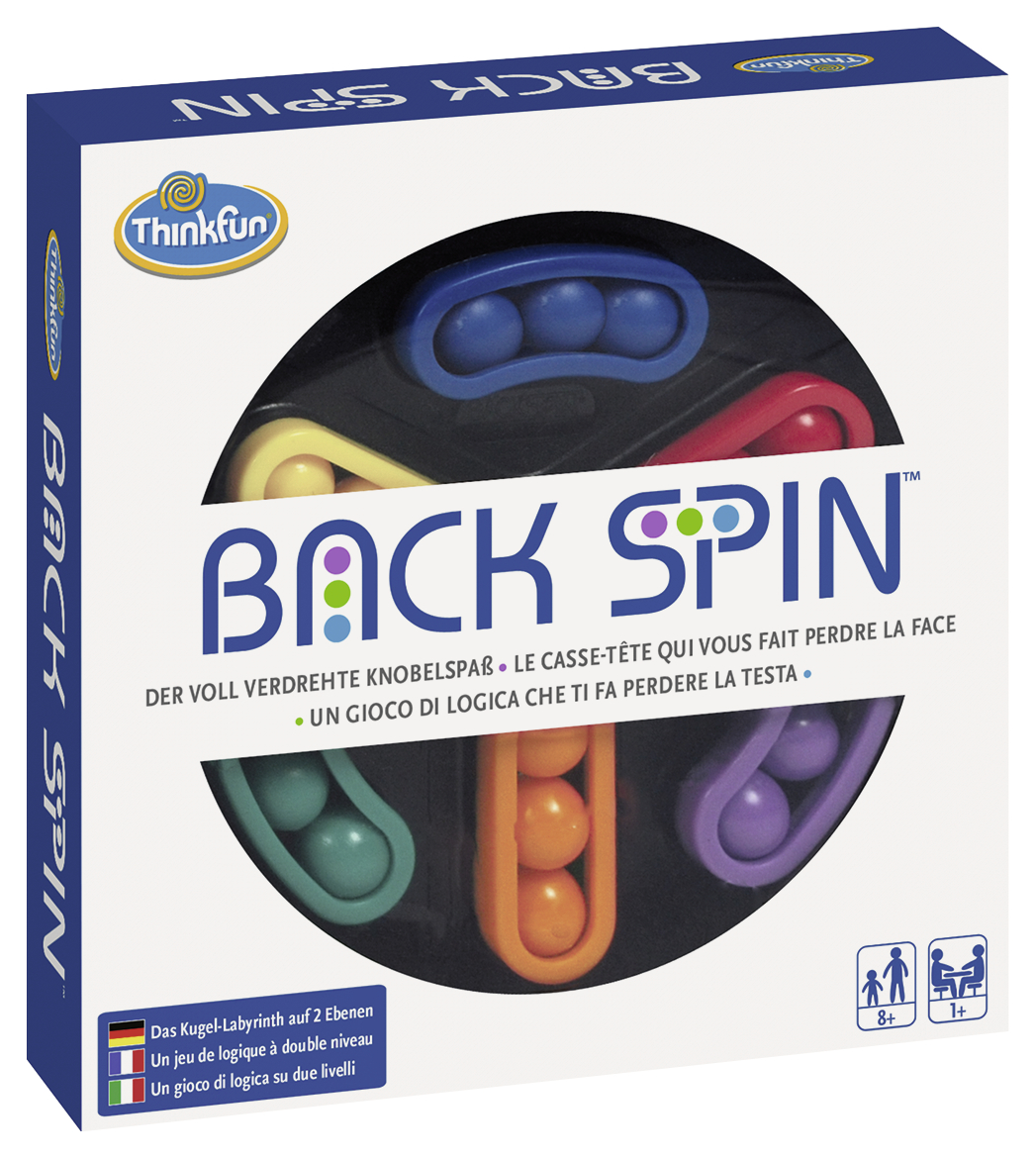Bei Back Spin™ erschafft sich der Spieler in jeder Runde sein eigenes, neues Rätsel, indem er die farbigen Kugeln auf der Ober- und Unterseite der Drehscheibe beliebig durcheinandermischt. Dann heißt es, die Kugeln mit Köpfchen und geschicktem Hin- und Herdrehen der Scheibe wieder farbig zu sortieren. Unzählige Farbkombinationen sorgen dabei für endlos langen Knobelspaß! Spiel-Inhalt: 1 Drehscheibe (bestehend aus einer Ober- und einer Unterseite), 35 bunte Kugeln in 9 verschiedenen Farben. Spieleranzahl: 1. Spieldauer: beliebig. Spieleanleitung in deutsch, französisch, italienisch.