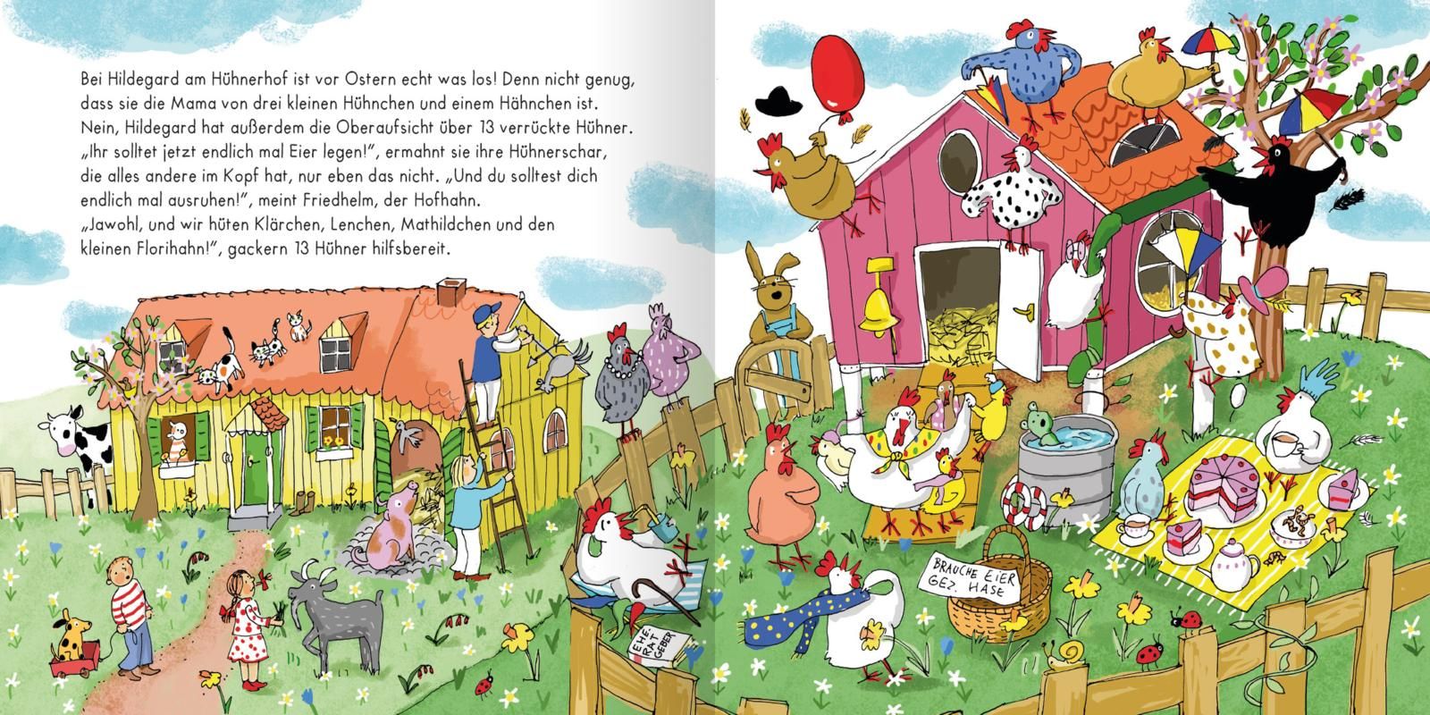 Denn Hildegard, das dicke Huhn, ist nicht nur Oberhuhn vom Hühnerhof, sondern auch Mama von drei kleinen Hühnchen und einem Hähnchen. Und ihre verrückte Hühnerschar hat mal wieder alles andere im Kopf als Eierlegen. Ob der Korb für den Osterhasen trotzdem rechtzeitig voll wird? Ein wimmeliges Osterbuch mit vielen Details zum Entdecken und Wiederfinden auf jeder Seite