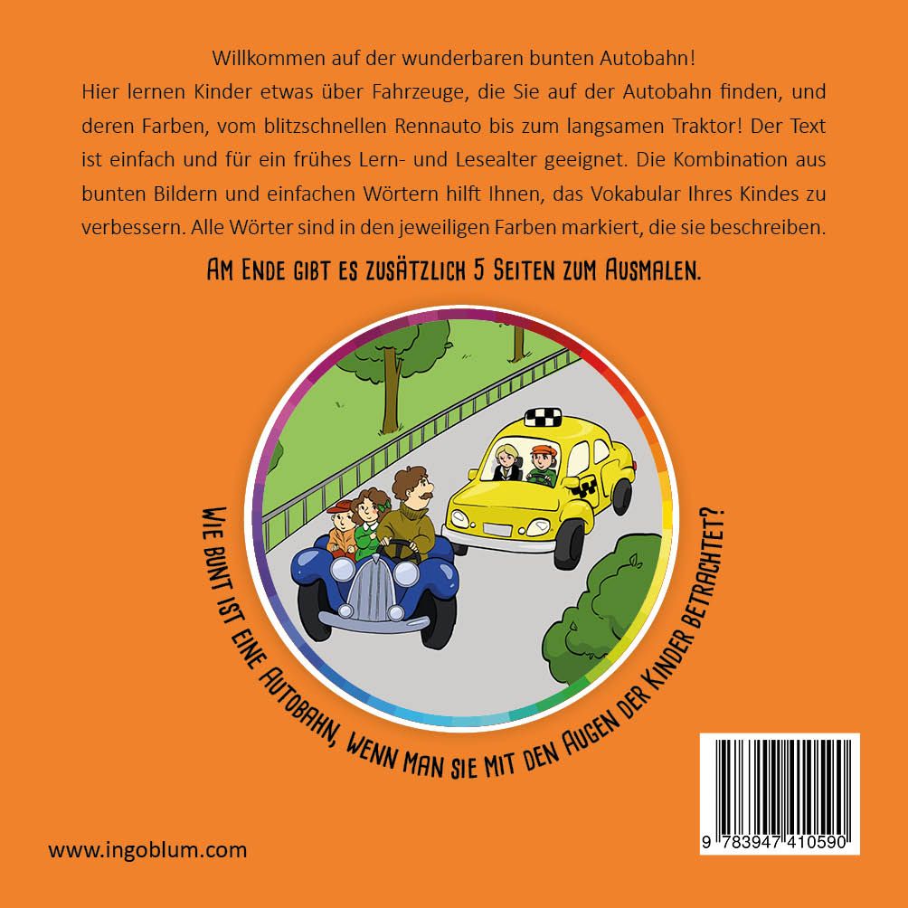 | Schlagworte | Autos malen • Bilderbuch • Bilderbuch ausmalen • Bilderbuch Autos • Fahrzeuge • Farben Lernen • Farben und Formen • Kinderbuch • Kinderbuch ab 3 • Kreativität Kinder • Lesen lernen • Malbuch • malen und zeichnen • Vorlesebuch • Vorlesegeschichten • Vorlesen • Wörter lernen |