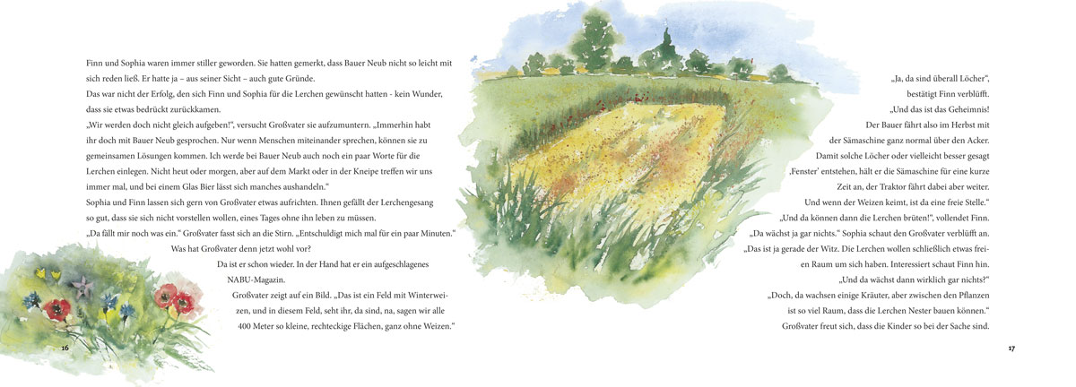 Eine Autopanne ist der Beginn einer spannenden Geschichte um das Thema Natur- und Artenschutz. Beim Besuch ihres Großvaters hören die Geschwister Sophia und Finn von Feldlerchen – und dass diese Frühlingsboten stark bedroht sind. Für ihre Idee, den Vögeln konkret zu helfen, bräuchten die Kinder etwas Geld – aber ob sie das zusammenbekommen?