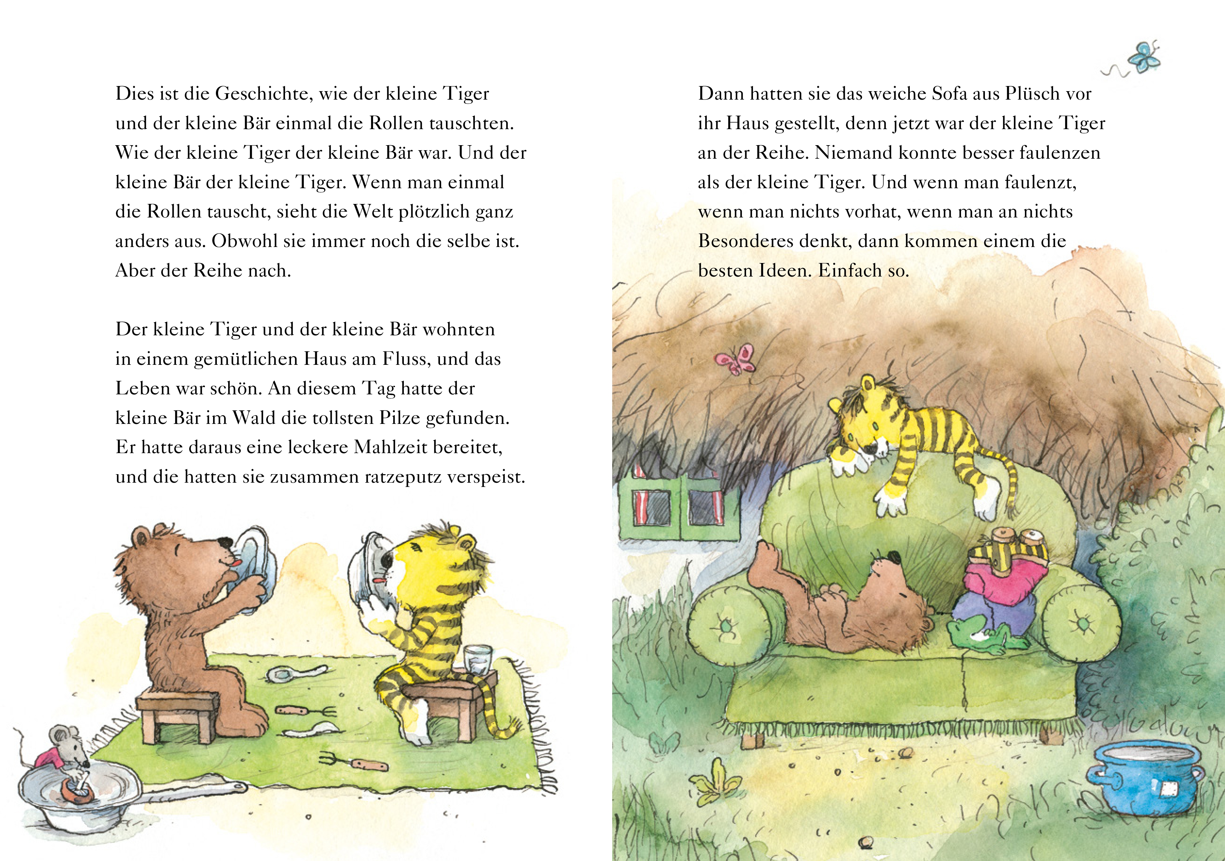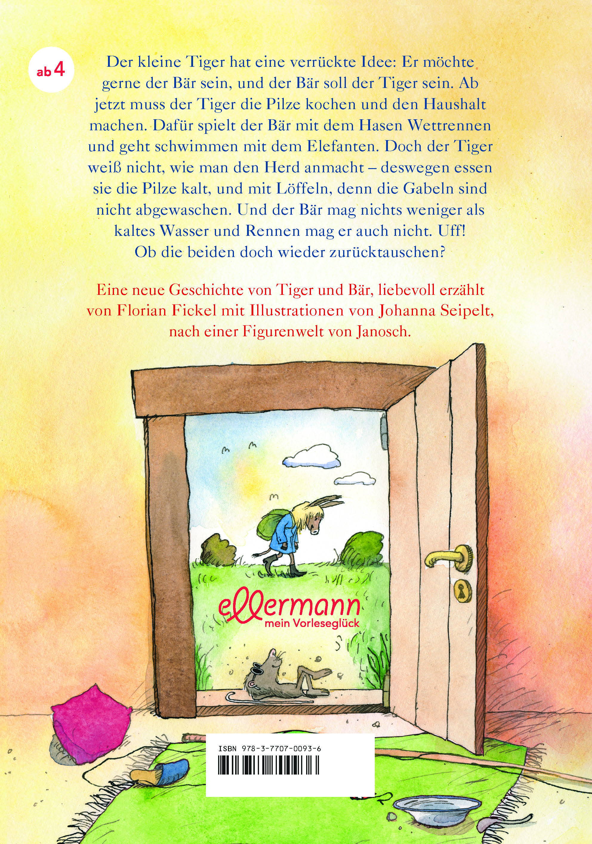 Komm, Tiger, lass uns neue Abenteuer erleben! Tiger und Bär machen sich einen Spaß und tauschen ihre Rollen: Tiger muss jetzt kochen und den Haushalt machen und Bär geht mit den Freunden schwimmen und um die Wette rennen. Dumm nur, dass Tiger so schlecht kocht wie Bär schwimmt. Ob sie nicht doch besser wieder tauschen? In diesem Abenteuer mit Tiger und Bär aus der Janosch-Welt erleben die kleinen Leser kleines Glück und großes Herz.