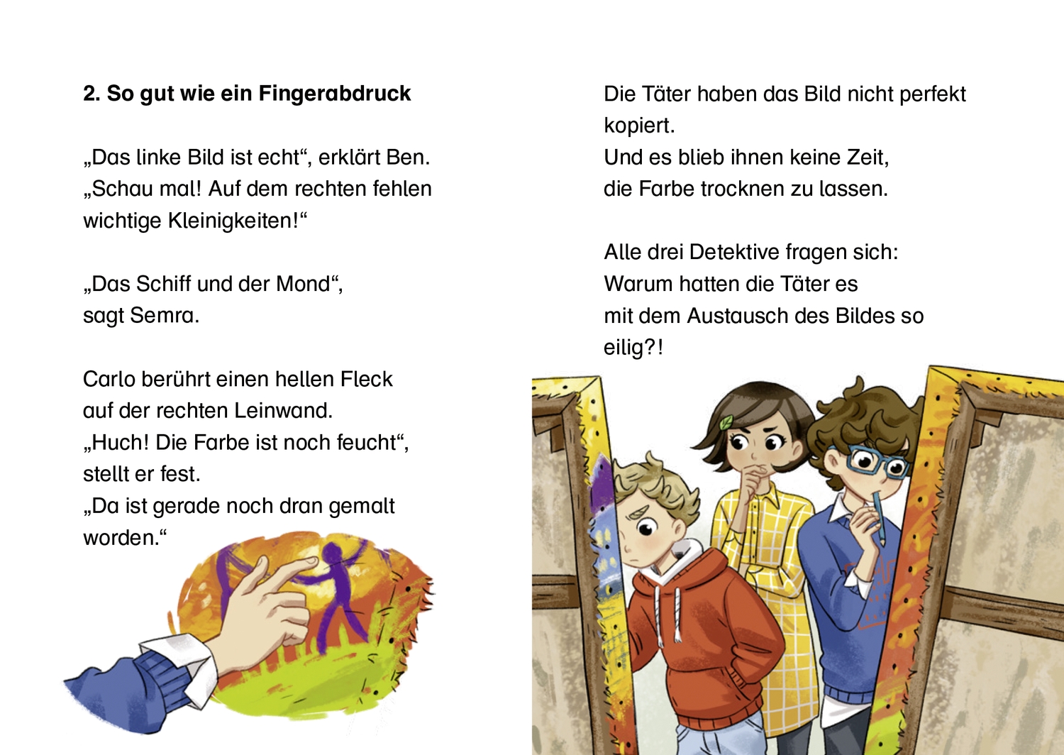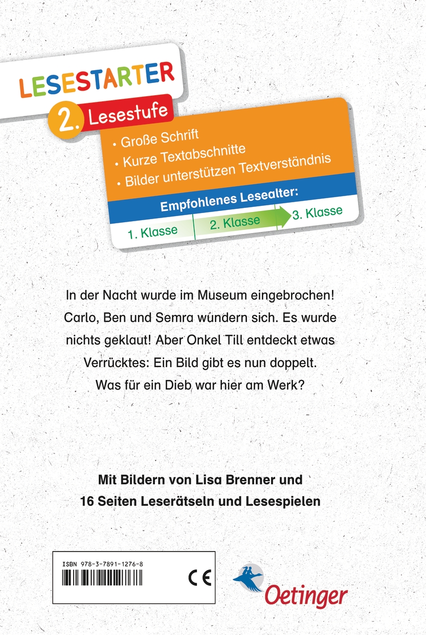 Hier ist Teamarbeit gefragt: Ein Fall für 3! Lesen und Mitraten. Im Museum wurde eingebrochen. Ungewöhnlich ist: Es wurde nichts gestohlen, aber ein Gemälde hat sich über Nacht verdoppelt. Es wurde abgenommen und lehnt an der Wand, allerdings zwei Mal. Welches Bild ist nun das Original, welches die Fälschung? Auf den ersten Blick scheinen die Bilder identisch. Doch die drei Detektive Carlo, Semra und Ben sehen ganz genau hin und entdecken kleine Unterschiede. Kommen sie dem Täter auf die Spur? Die Lesestarter von Oetinger motivieren auch leseschwache Kinder zum Lesen. Wie? Mit bekannten Autoren, starken Charakteren und populären Themen, die Kinder im Alter von fünf bis zehn Jahren begeistern. Und mit vielen Bildern, Spielen und Leserätseln. Dieser Mitrate-Krimi für kleine Spürnasen komm mit coolen Illustrationen in Comic-Optik daher und ist perfekt geeignet für kleine Erstleser.