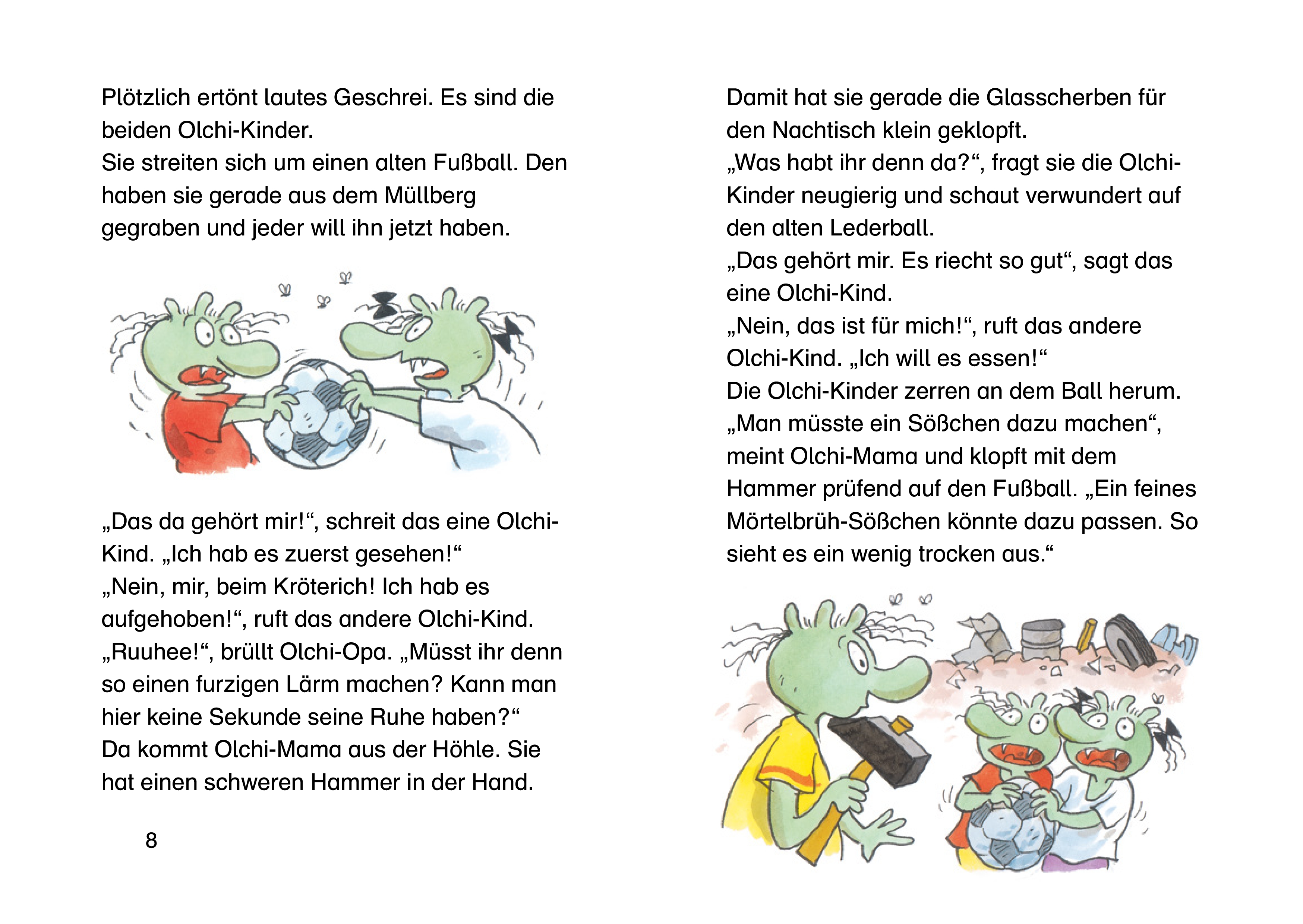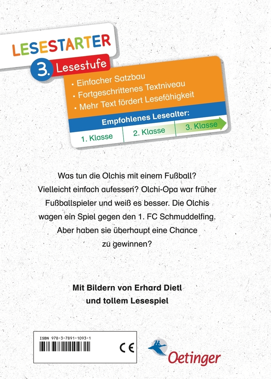 1:0 für die Olchis! Fußballspaß aus Schmuddelfing. Was ist denn das? Als die Olchi-Kinder auf dem Müllberg einen alten Fußball finden, wissen sie nicht, was sie damit anfangen sollen. Vielleicht mit einer leckeren Soße verspeisen? Nur der Olchi-Opa kennt sich aus und weiß, wofür so ein Ball gut ist. Schließlich war er früher selbst mal Fußballspieler! Er schlägt den Olchis ein Freundschaftsspiel gegen den 1.FC Schmuddelfing vor. Aber haben die Olchis überhaupt eine Chance gegen diese Profis? Die Lesestarter von Oetinger motivieren auch leseschwache Kinder zum Lesen. Wie? Mit bekannten Autoren, starken Charakteren und populären Themen, die Kinder im Alter von fünf bis zehn Jahren begeistern. Und mit vielen Bildern, Spielen und Leserätseln. So einfach ist Lesenlernen mit den Olchis: Liebenswerte Figuren, einfache Texte, und beliebte Themen motivieren und machen Spaß.