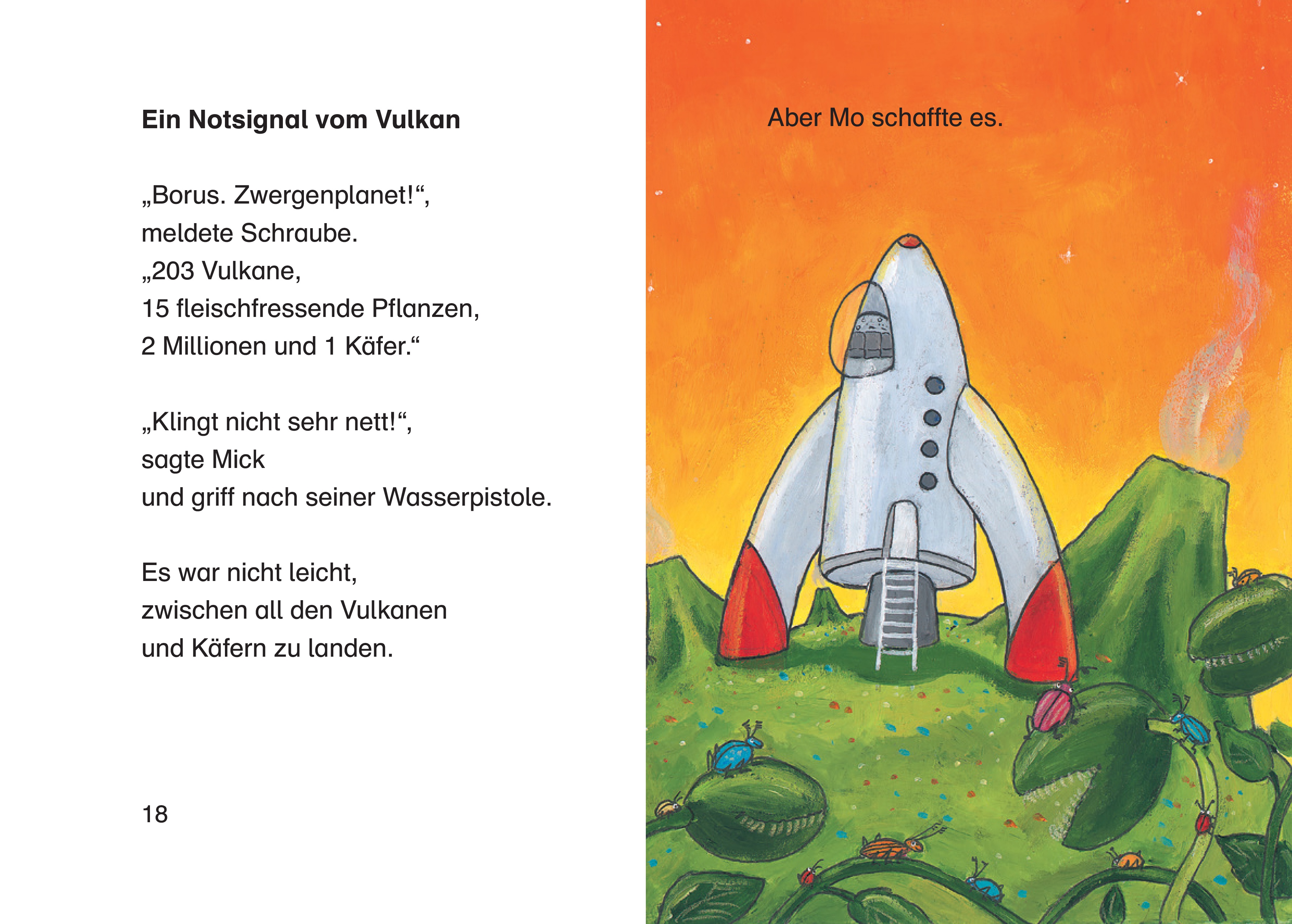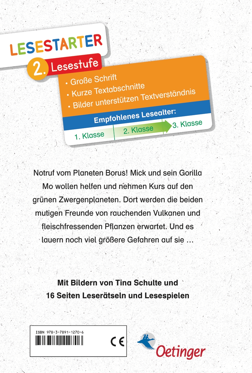 Mit Mick und Mo ins Leseuniversum! Ein Weltraumabenteuer von Cornelia Funke. Notruf vom Planeten Borus! Mick und sein Stoffgorilla Mo nehmen mit ihrem Raumschiff Kurs auf den Zwergenplanet. Doch als sie endlich da sind, ist die Landung zwischen all den rauchenden Vulkanen noch das kleinste Problem. Die Lesestarter von Oetinger motivieren auch leseschwache Kinder zum Lesen. Wie? Mit bekannten Autoren, starken Charakteren und populären Themen, die Kinder im Alter von fünf bis zehn Jahren begeistern. Und mit vielen Bildern, Spielen und Leserätseln. Bestsellerautorin Cornelia Funke erzählt in diesem Erstlesebuch von einer ebenso wunderbaren wie fantasievollen Abenteuerreise im Kinderzimmer. Besonders toll für die Jungen unter den Leseanfängern.